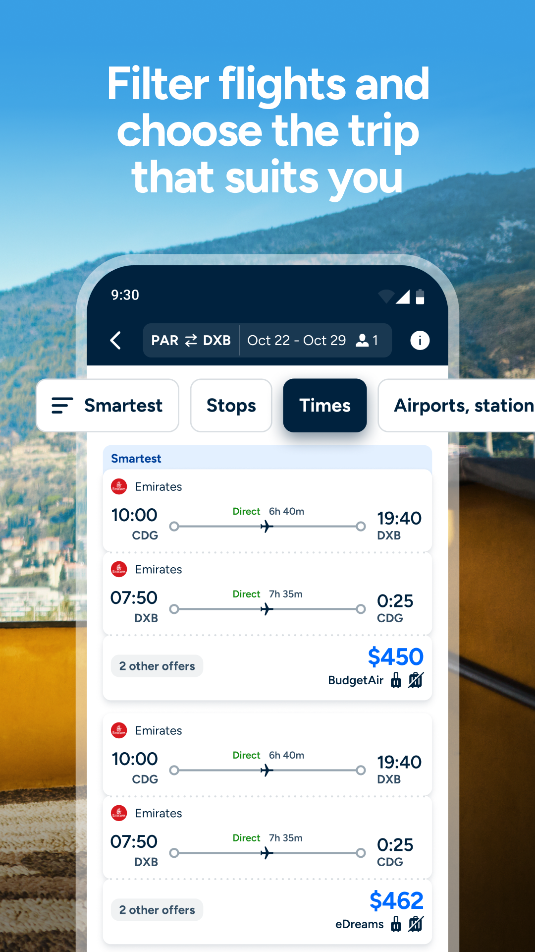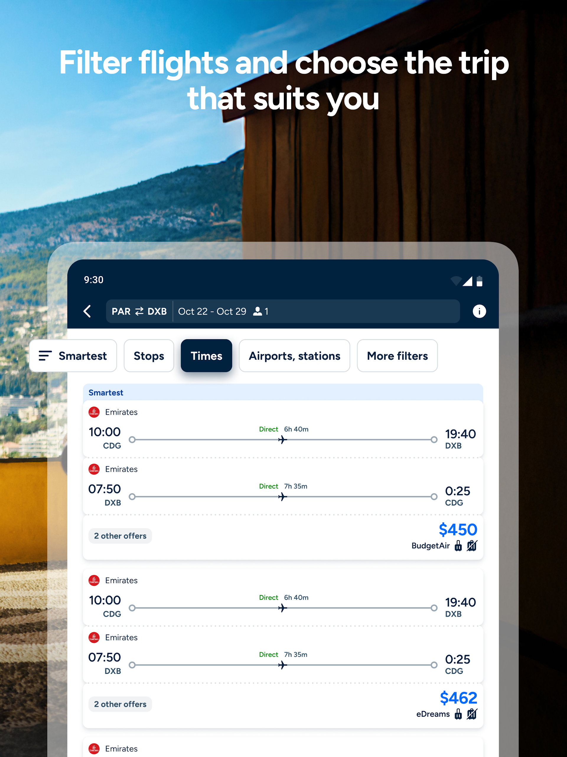 - Use filters to refine your search: number of stopovers (or direct flights), trip duration, departure and arrival airports, airlines, and more.