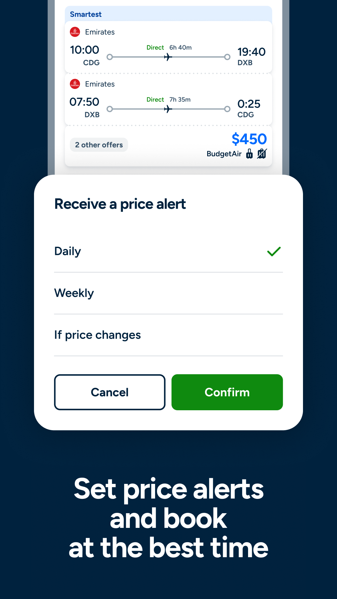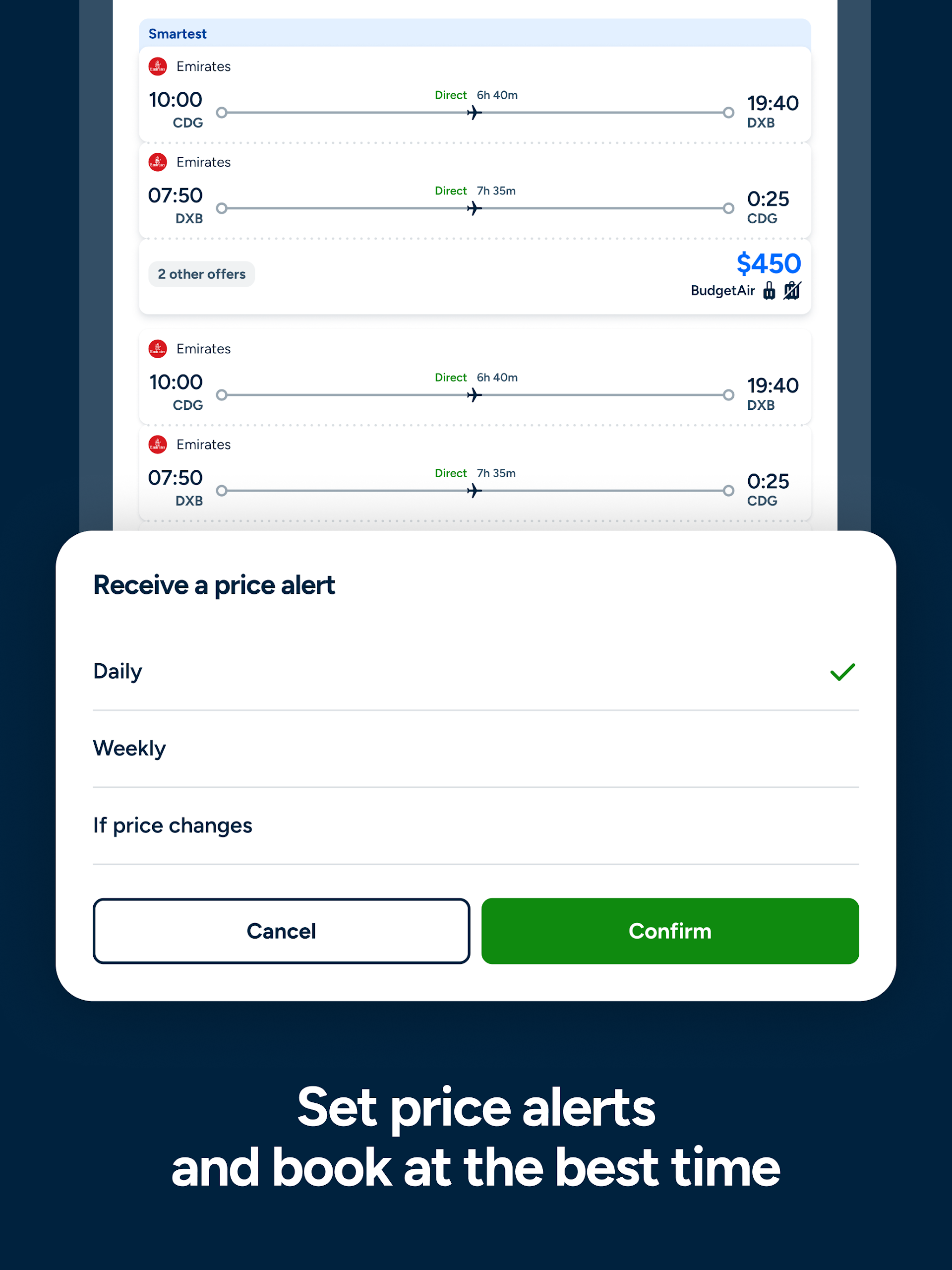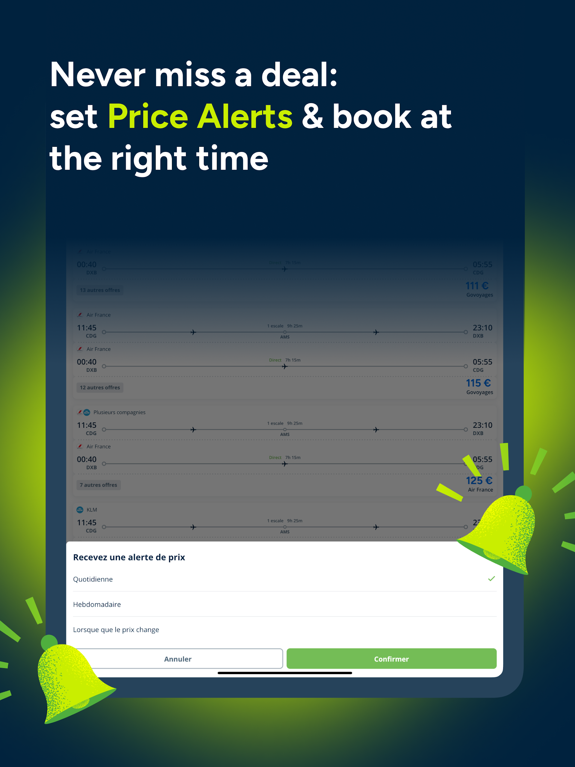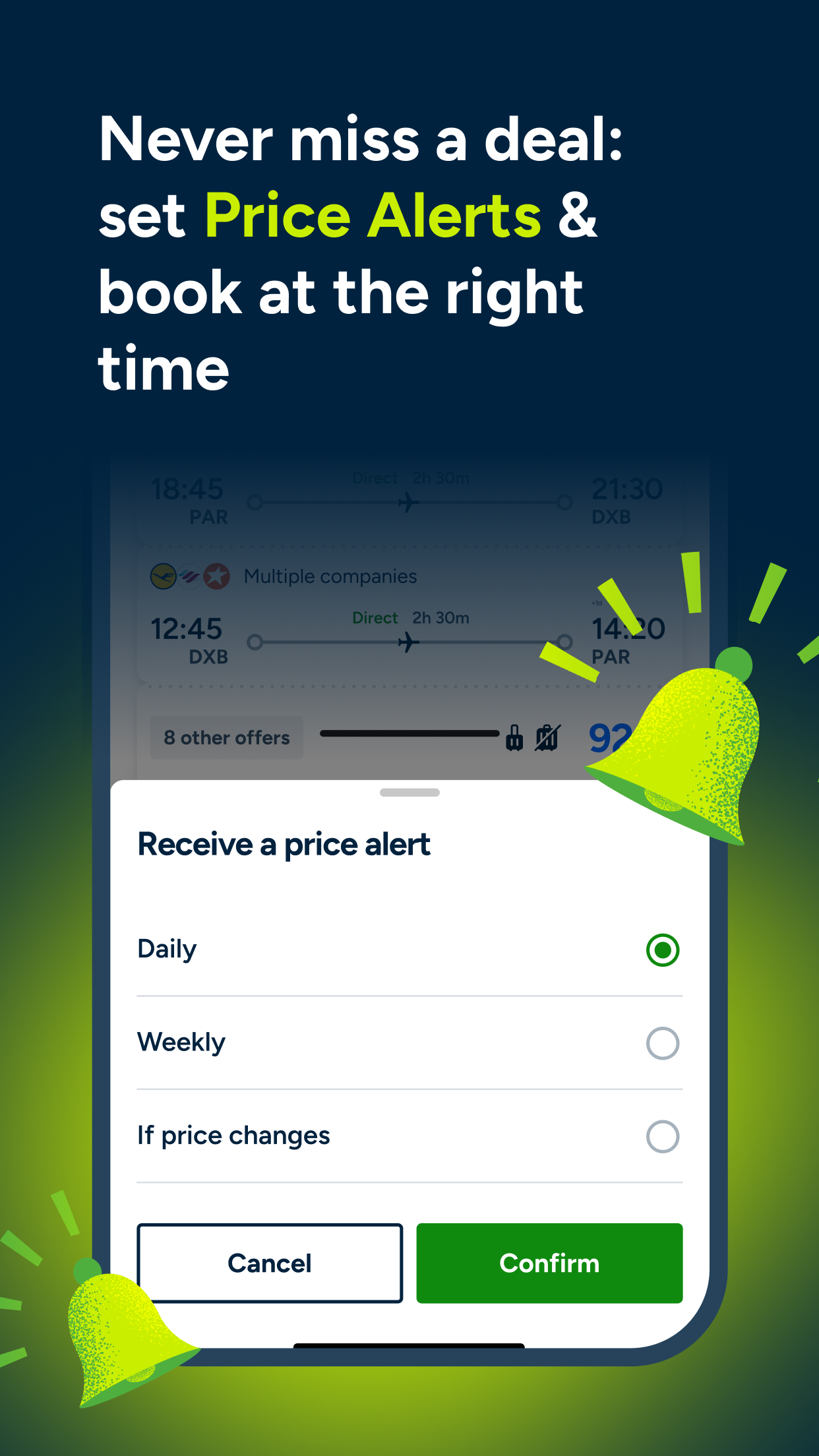 - Activate price alerts for your favorite destinations and be notified when ticket prices go down.
