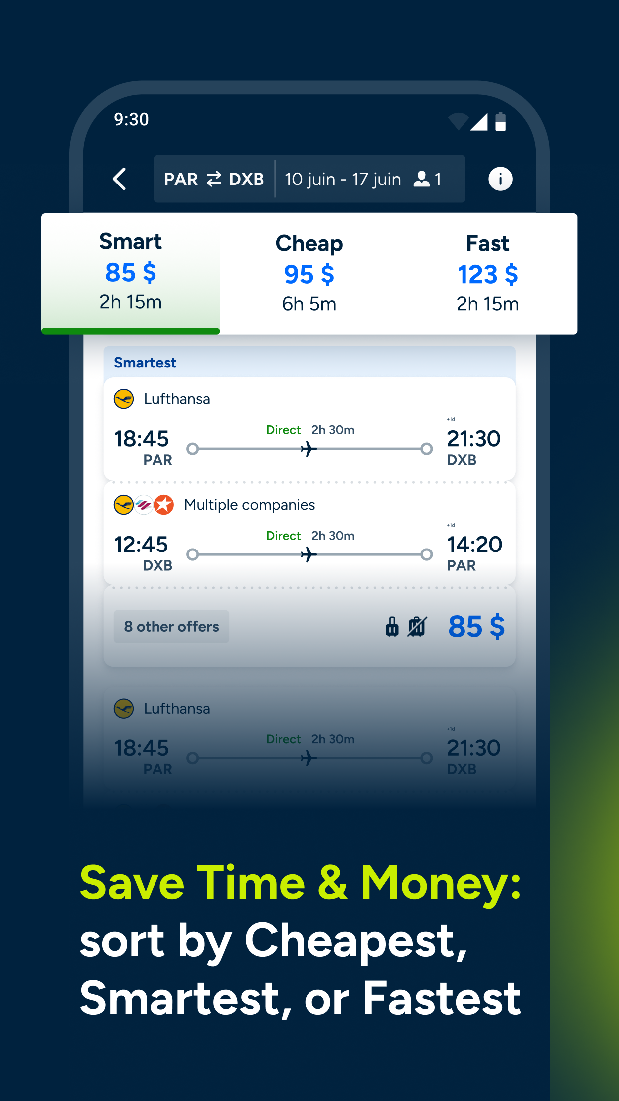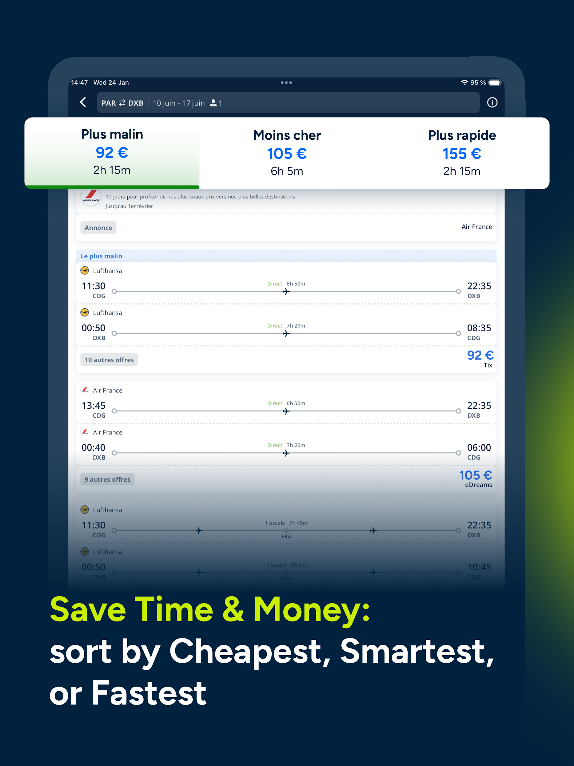 - Search flights from over 600 airlines and travel agencies such as eDreams, Opodo, Lastminute, Air France, Royal Air Maroc, Turkish Airlines, TAP Air Portugal, Corsair, British Airways, Emirates, Lufthansa, Qatar Airways, Air Caraïbes, and more.