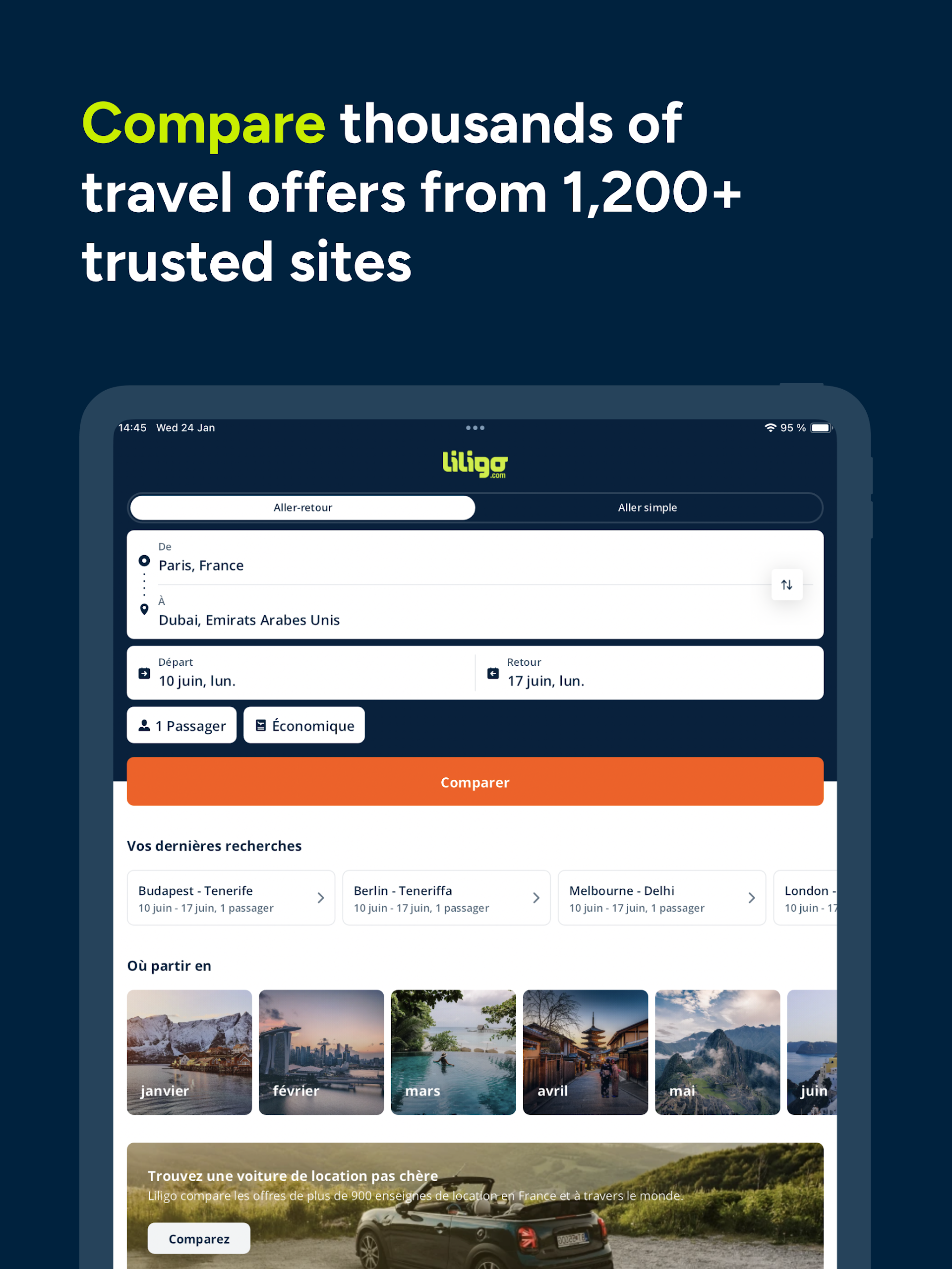 Liligo is a travel search engine that compares plane tickets, train, bus, car rental and hotel offers in one click. You can compare all offers on the same platform to find the best prices and simplify the preparation of your trip.