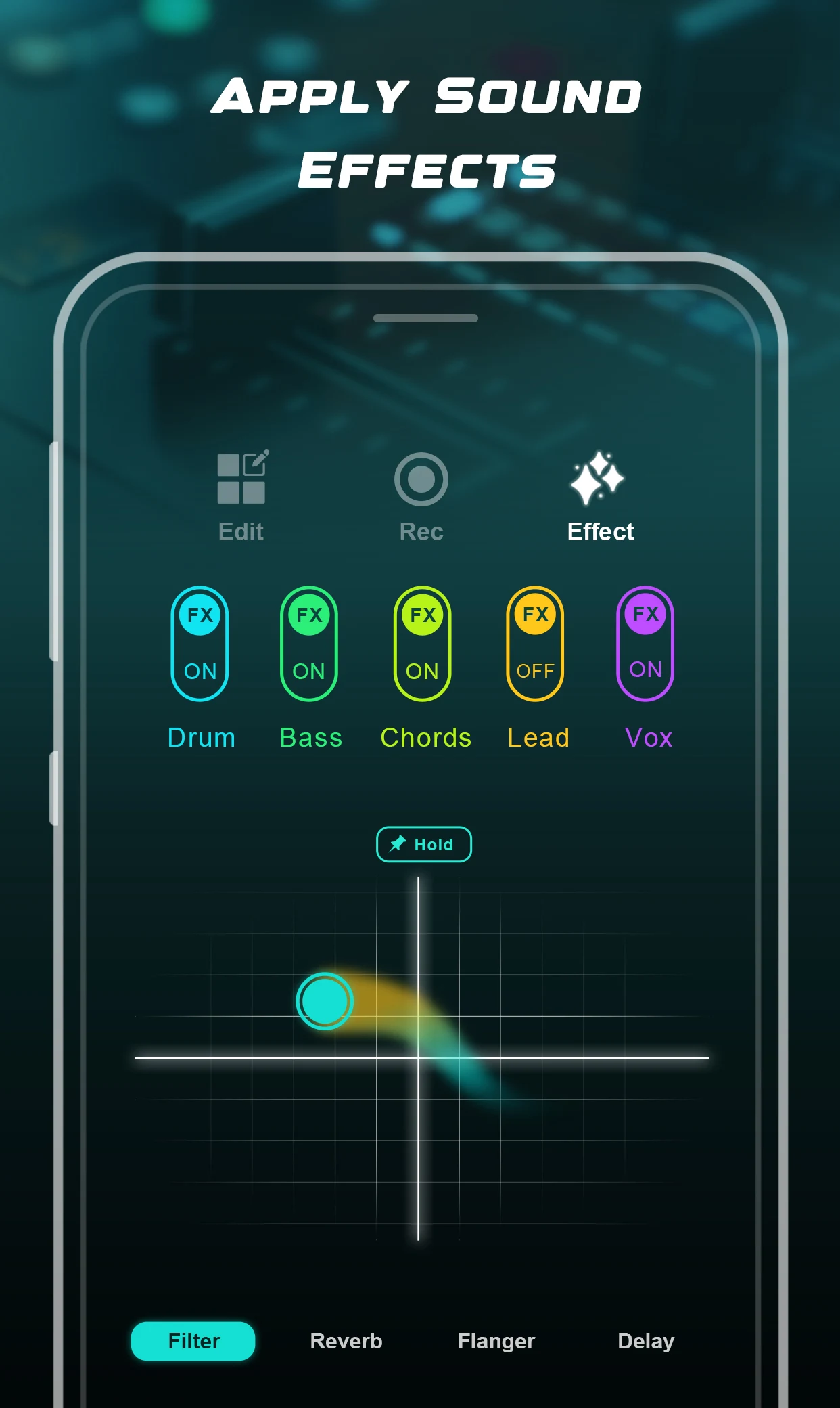 - Professional effects are available to enhance your loops, including filter, flanger, reverb, and delay for added dynamism.