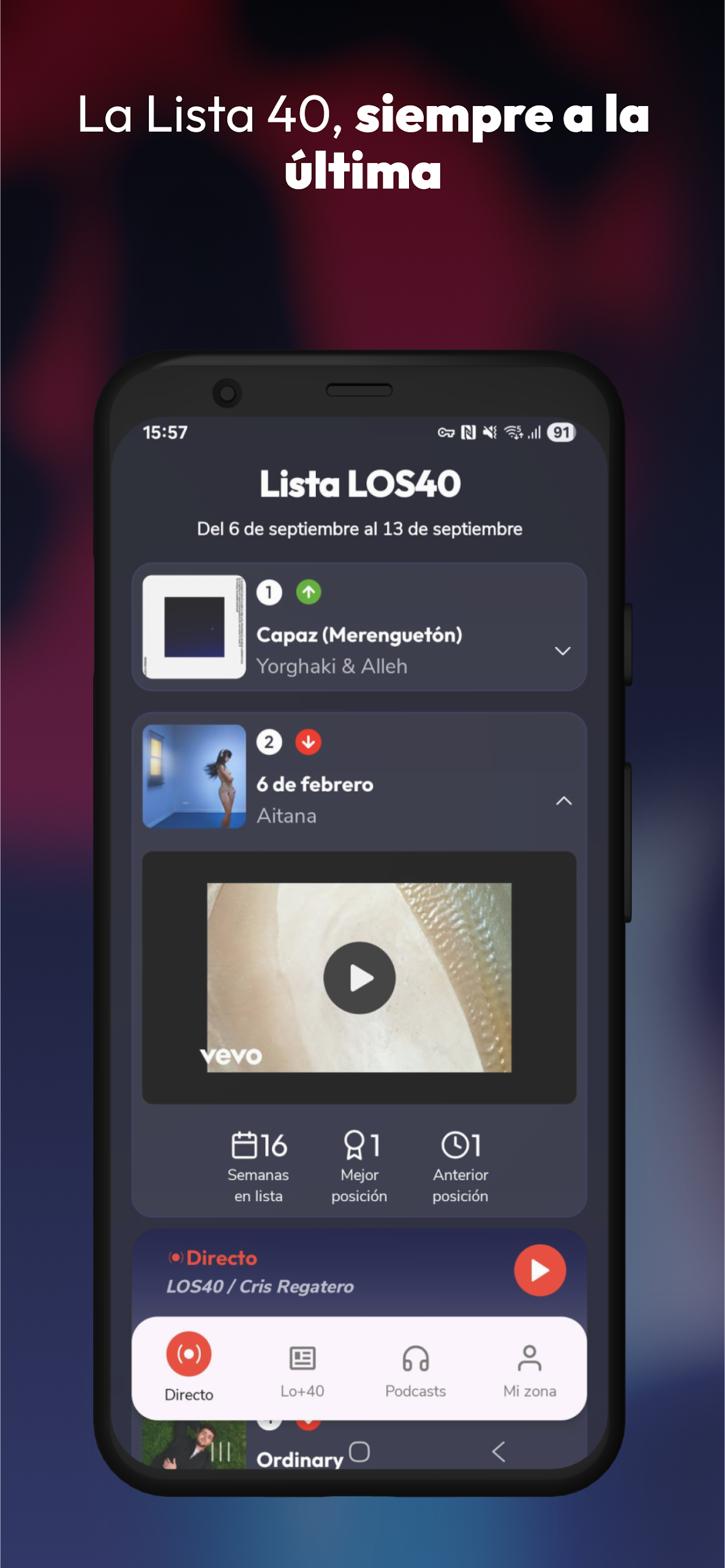 ✨ Interactive Features: 🎫 Voting for your favorite songs on the LOS40 list: Participate in the LOS40 chart by voting for your favorite tracks and influencing the rankings.