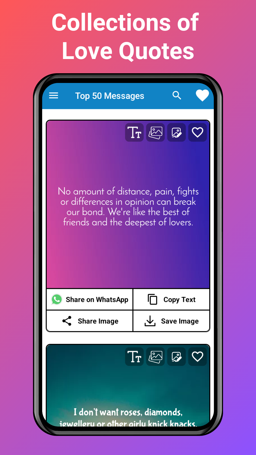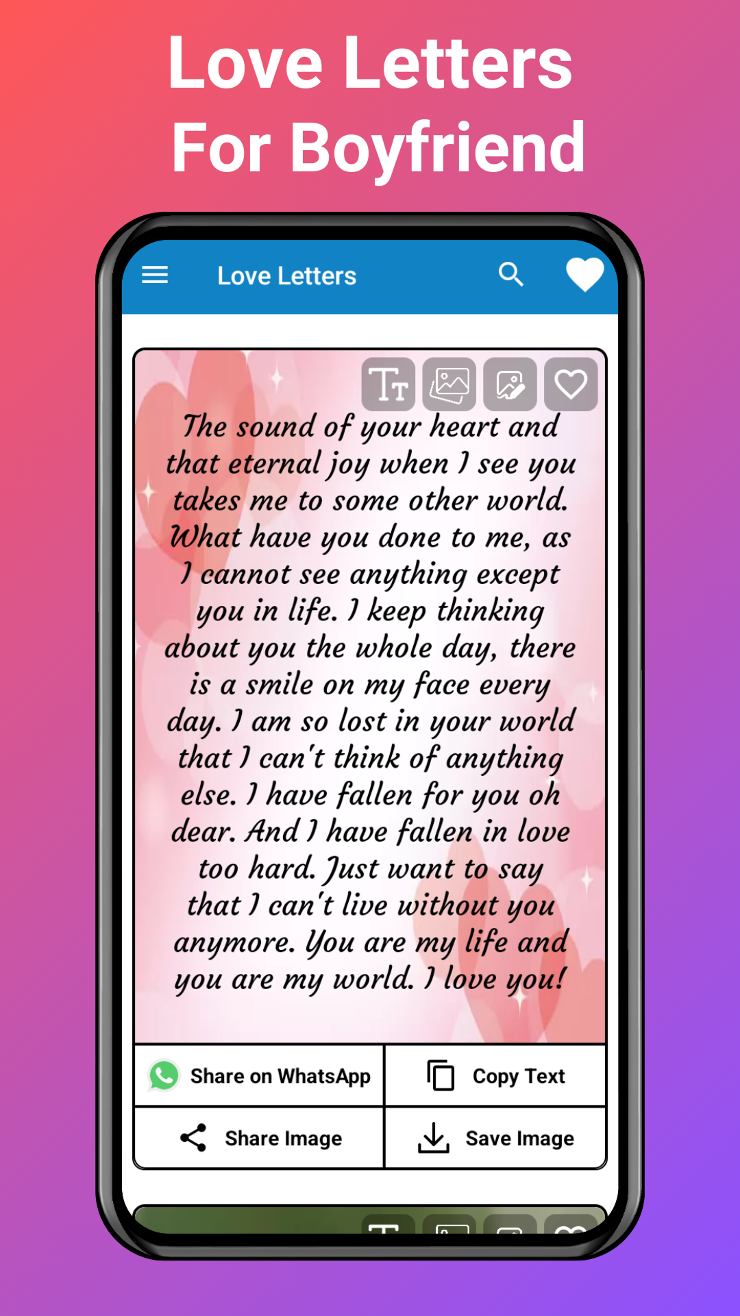 Love Messages For Bf app is the perfect way to convey your love for your boyfriend. The app offers a wide variety of categories, including Valentine's day notes, love messages for boyfriend, flirty text messages, poems, and gifts to show how much you care.