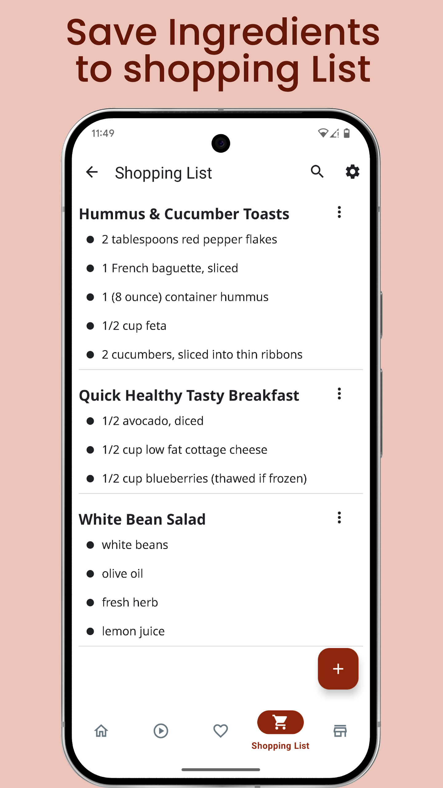 An organized shopping list function enables users to compile ingredient lists, ensuring nothing is overlooked during recipe preparation. Users have the flexibility to add items directly from their selected recipes.