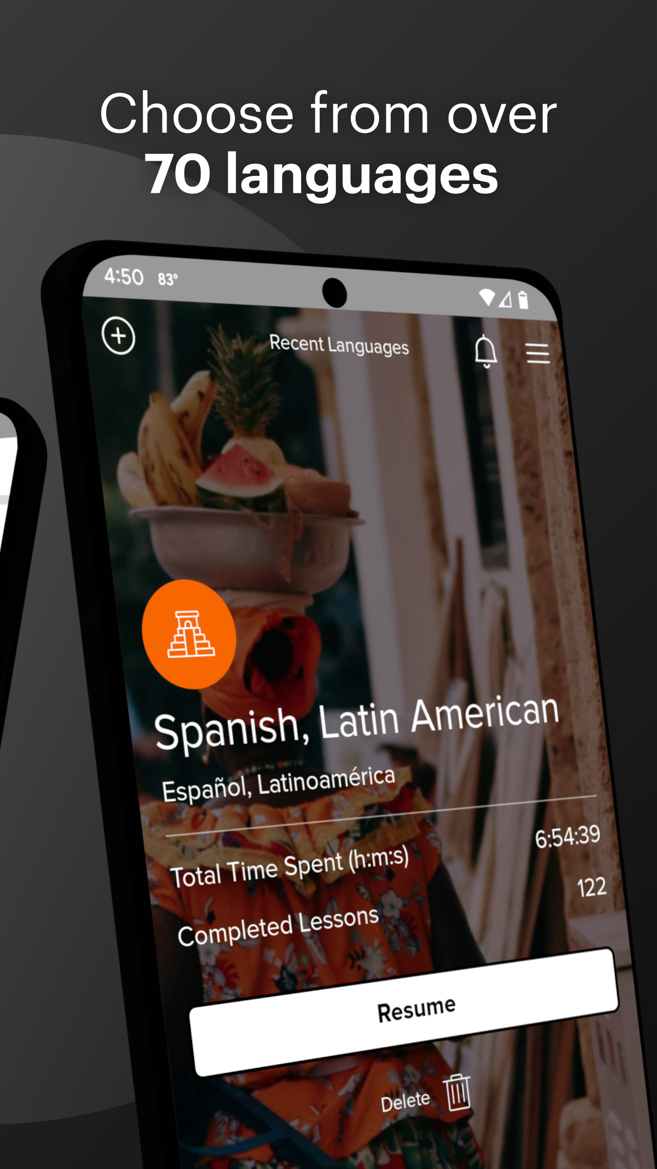 If you've studied a language recently, you'll find it on the "Recent Language" cards - swipe through them and tap on the "Resume" button to continue learning.