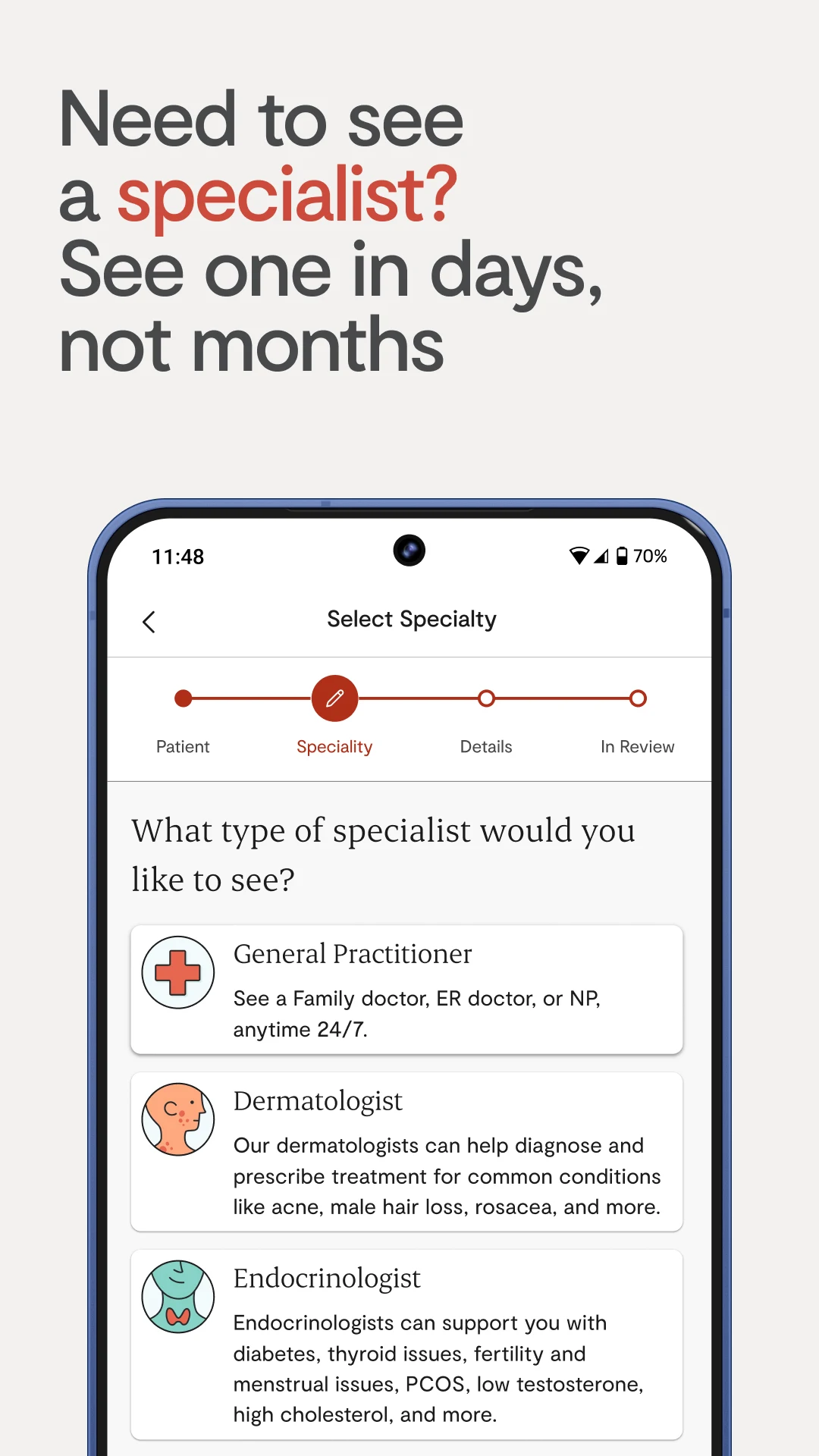 • Over 15 specialties—access experts like dermatologists, mental health specialists, endocrinologists, naturopaths, and others
