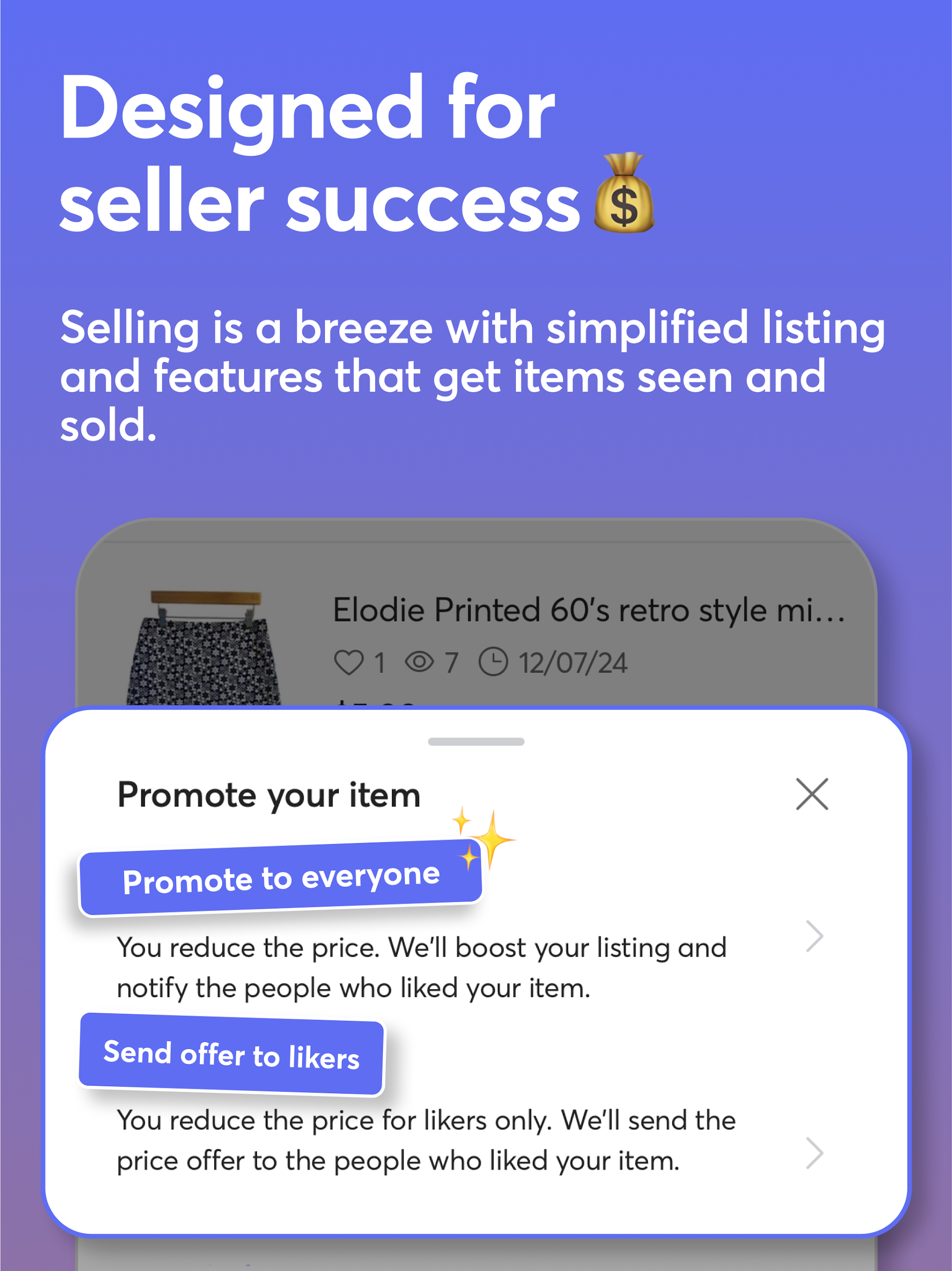 Set up Smart Pricing from the listing page. Just name a start price and a floor price – we’ll gradually lower it based on market demand.