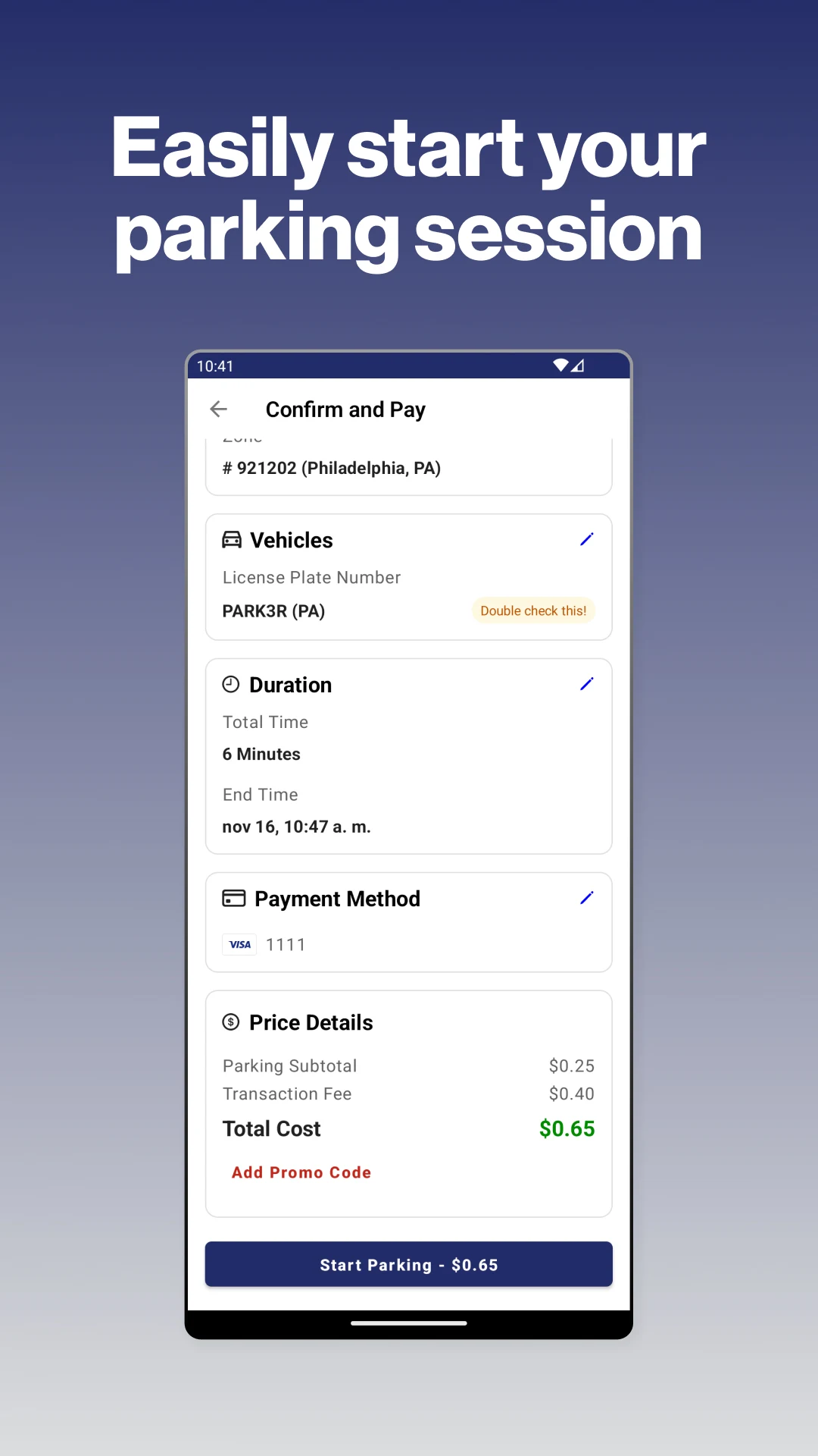 3. Confirm your information then press the “Start Parking” button and you’re good to go!