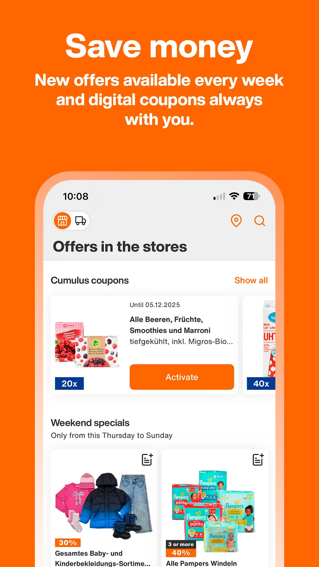 Ditch physical papers and access all your coupons and vouchers digitally within the Migros app. Activate beforehand and automatically enjoy discounts either at checkout or when placing online orders.
