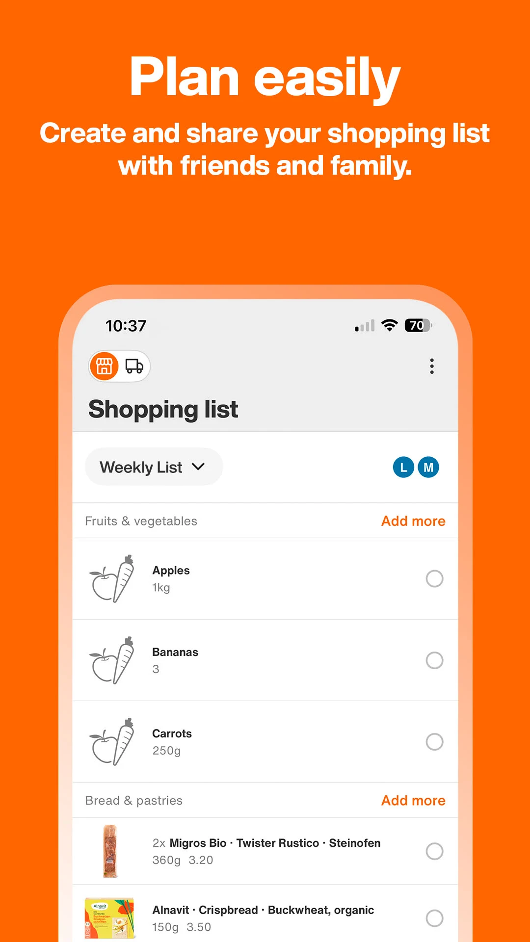 The digital shopping assistant offers all the benefits of Migros right at your fingertips, no matter where you are. Stay updated on the latest special offers and new products at your local Migros store from the comfort of your home and get inspired by a plethora of recipes. Easily place online orders and have your purchases delivered to your doorstep, or use subitoGo for in-store shopping without waiting in line. The shopping list feature helps you plan your shopping on-the-go. Whether in-store or online, you can redeem Cumulus coupons and vouchers, accumulate points with your Cumulus Card, and gather digital stamps – all through the Migros app.