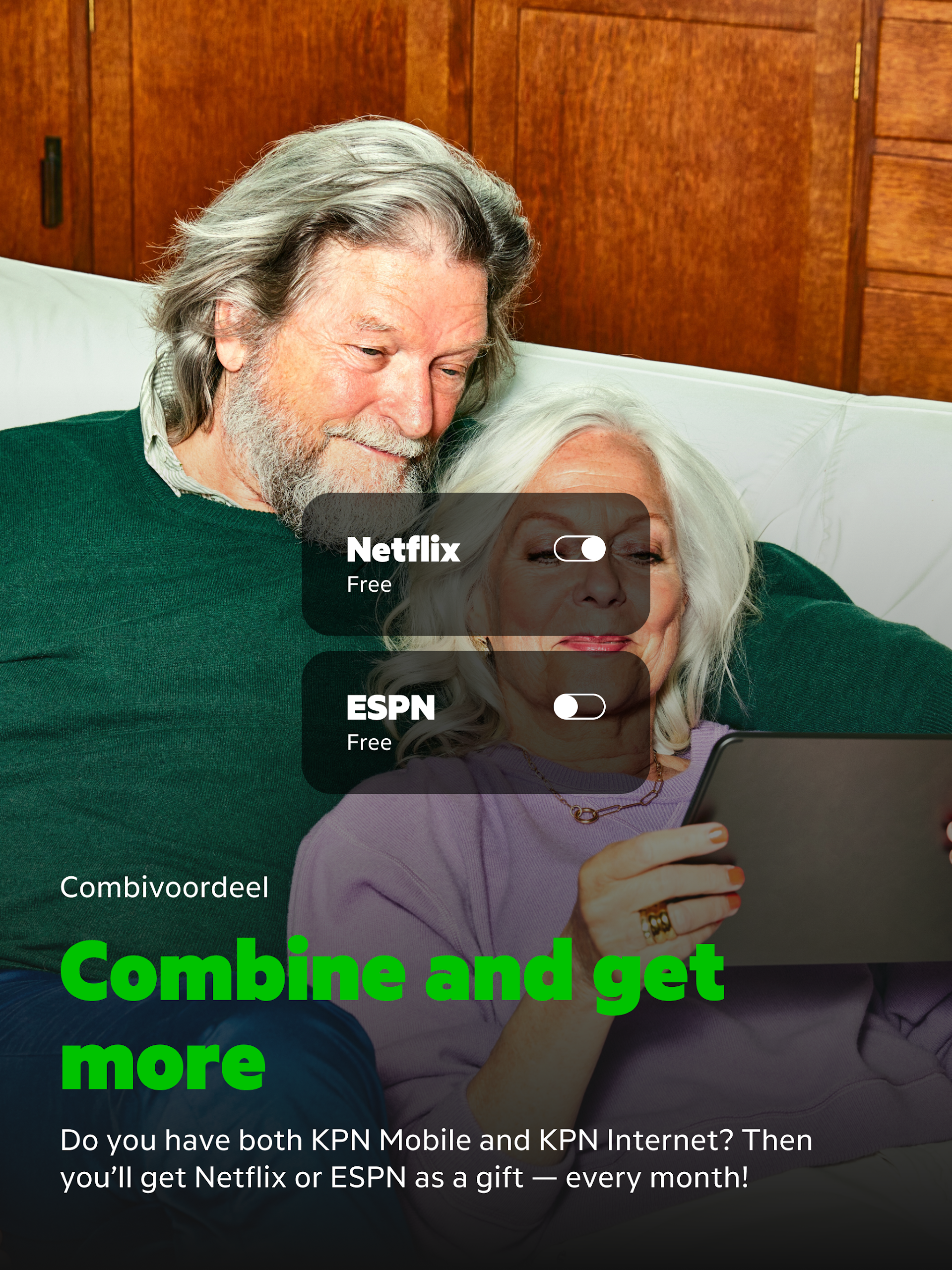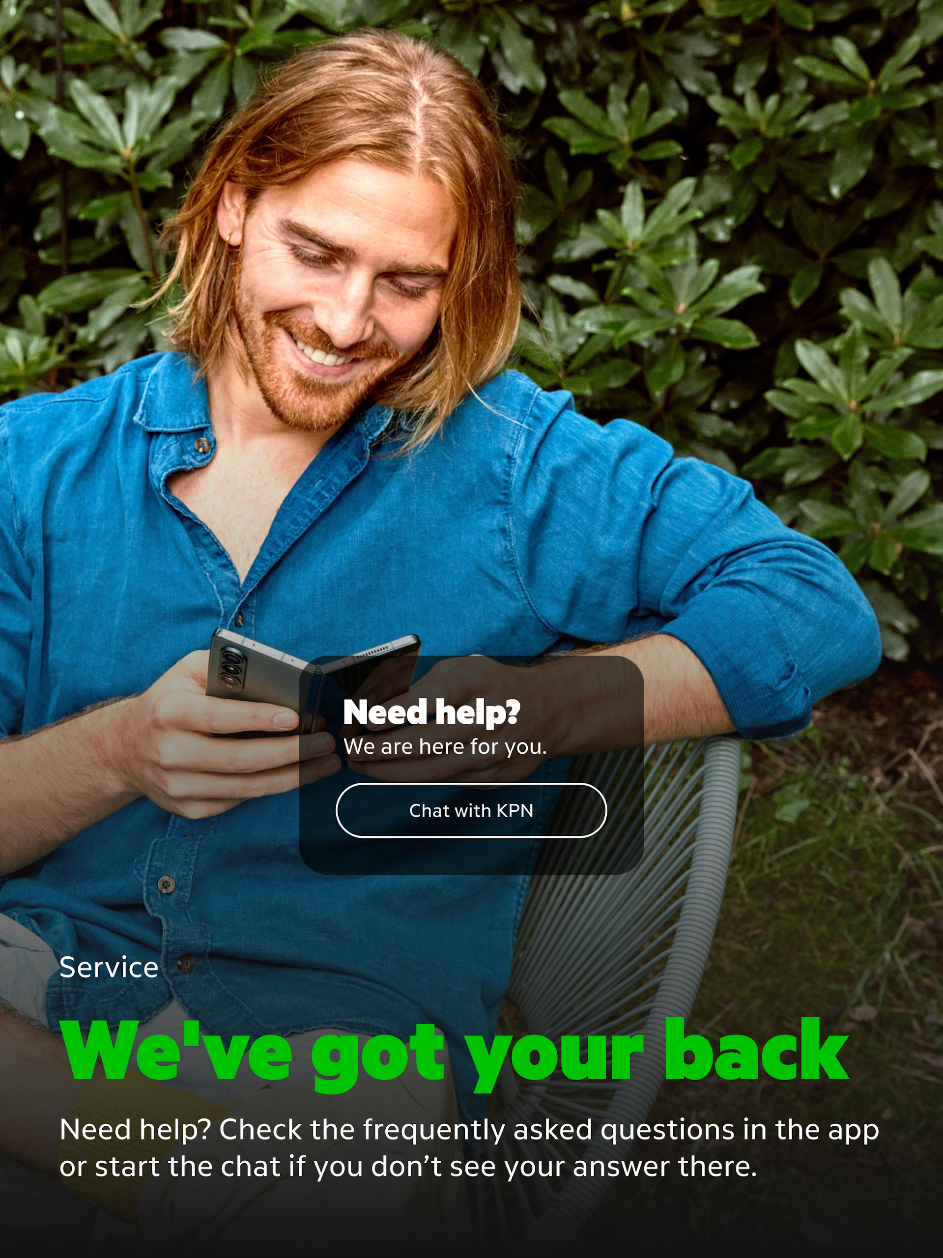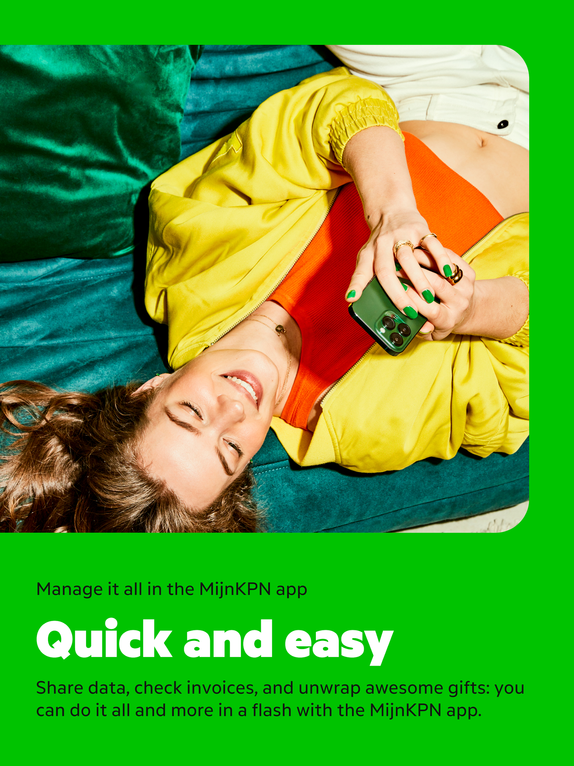 At the heart of the KPN Group, we strive to create a digital experience that makes you feel secure and provides you with a great service. Our Mobile app for Android is no exception. With it, you can manage all the details of your KPN business account, including your subscriptions for mobile, internet, TV, and prepaid.