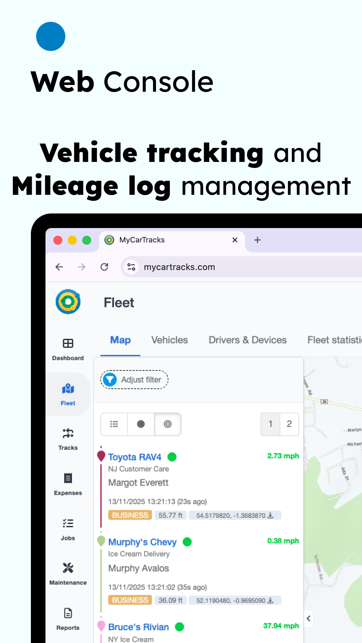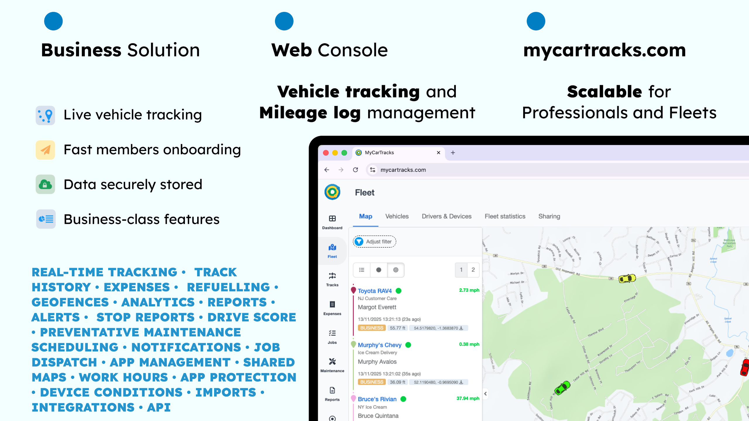 Unlike basic mileage trackers, MyCarTracks is designed to adapt to various needs. Independent drivers, small business owners, and large fleet operators all experience a customized approach. Utilize it as your personal trip log and mileage tracker, or implement it across your team to oversee multiple vehicles simultaneously. Benefit from live GPS tracking on maps, instantaneous trip syncing to the cloud, and advanced features like geofencing, safety monitoring, Drive Score feedback, and maintenance reminders for fleet management. (No additional equipment is necessaryâjust your smartphone!)
