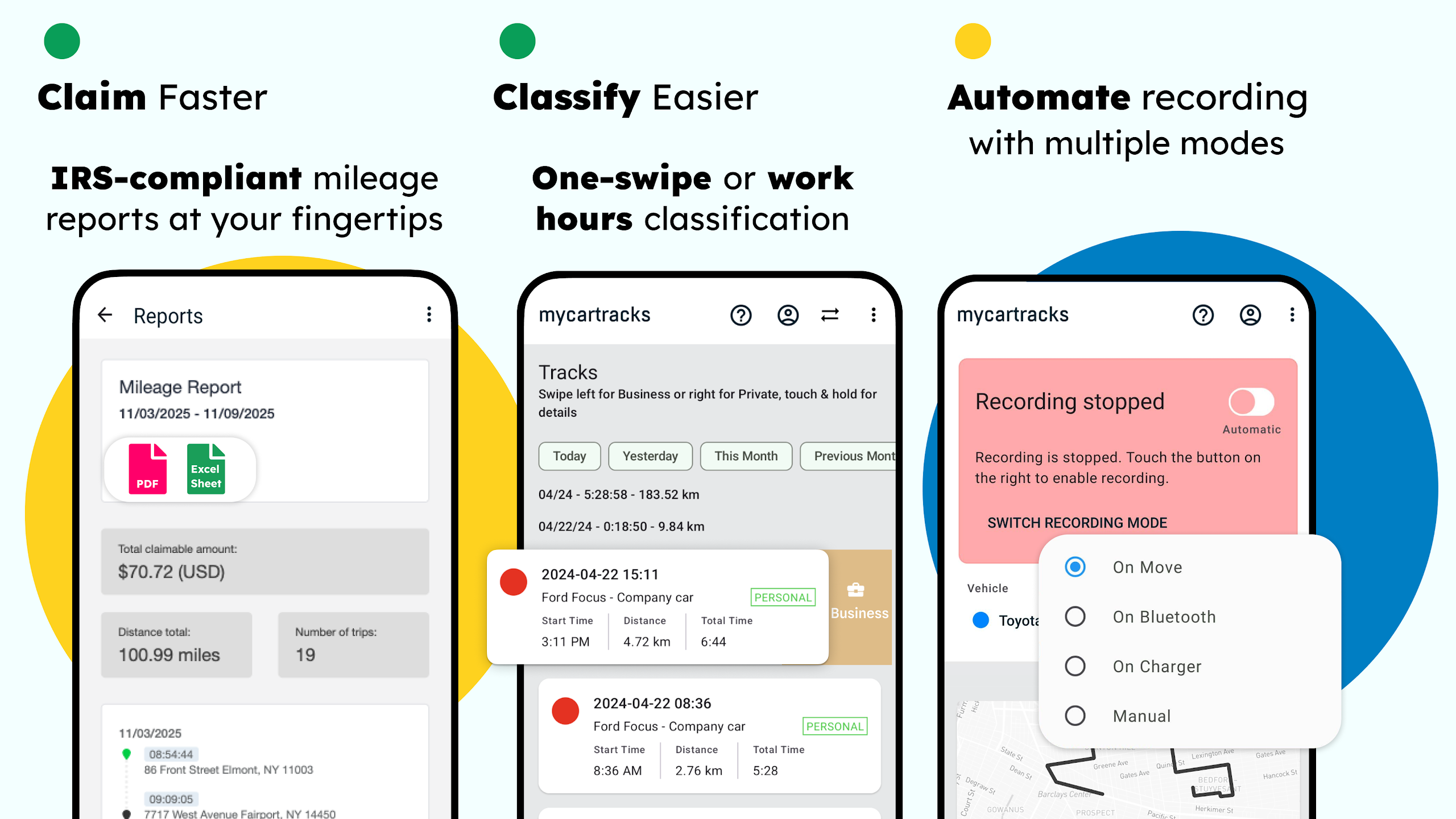 Track every trip effortlessly with automatic logging & tax-ready reports for personal or business use, all in one app.