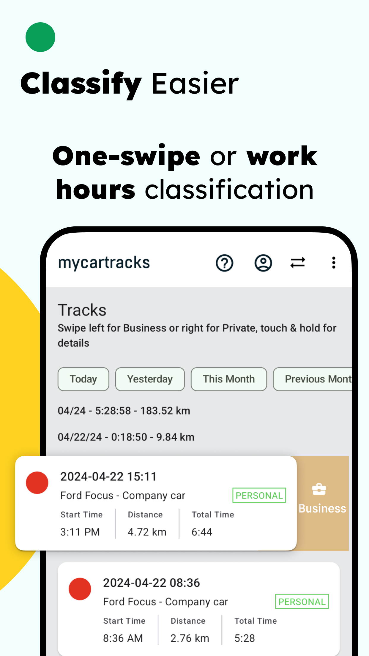 MyCarTracks app allows you to change the Business or Personal purpose anytime during the day or classify journeys later with a simple swipe. Work hours feature let you set up the hours of any day when tracks will be auto classified.