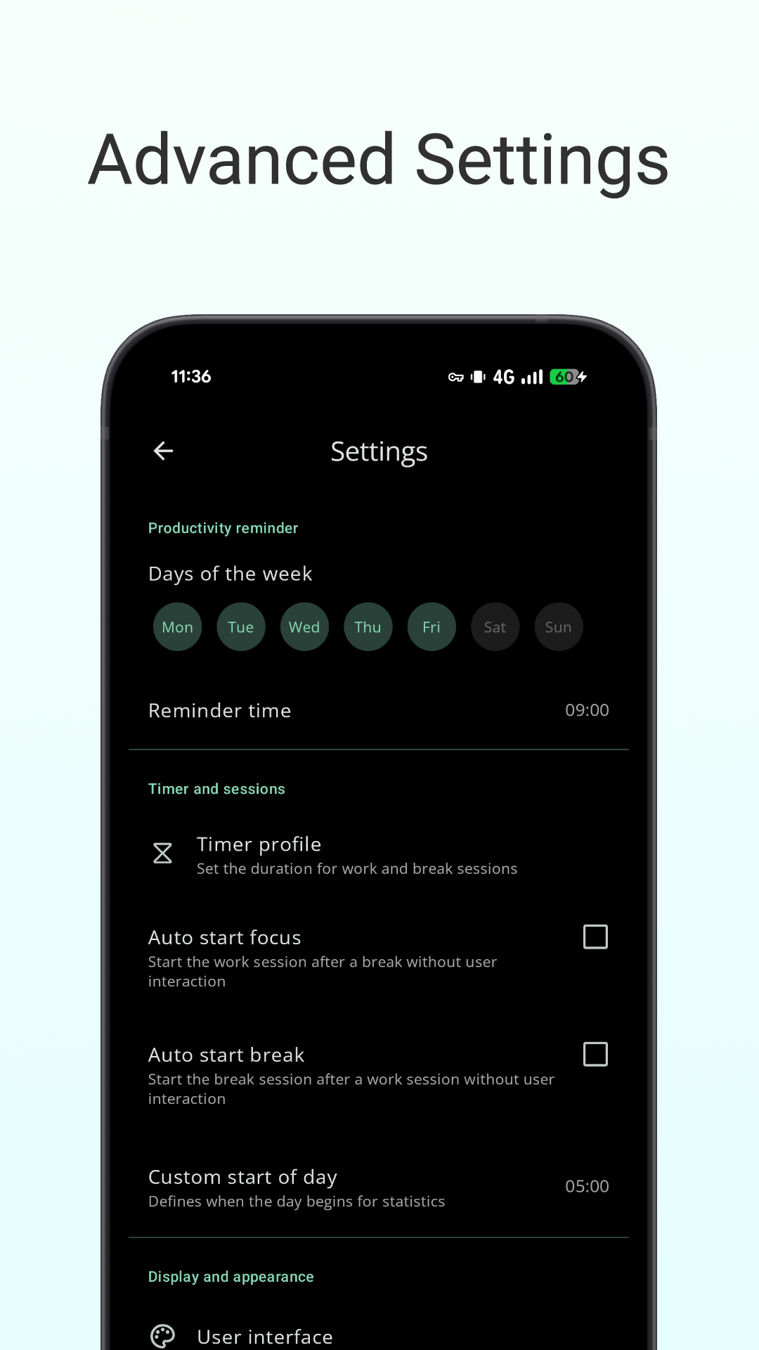 • Disable sound and Wi-Fi connection (up to Android 10) during work sessions