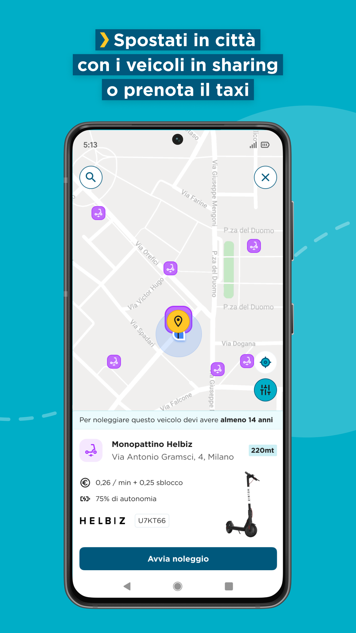 Rent electric scooters to move swiftly and sustainably in major Italian cities! Locate the nearest scooter on the interactive map, reserve it, and make payments directly through the app.