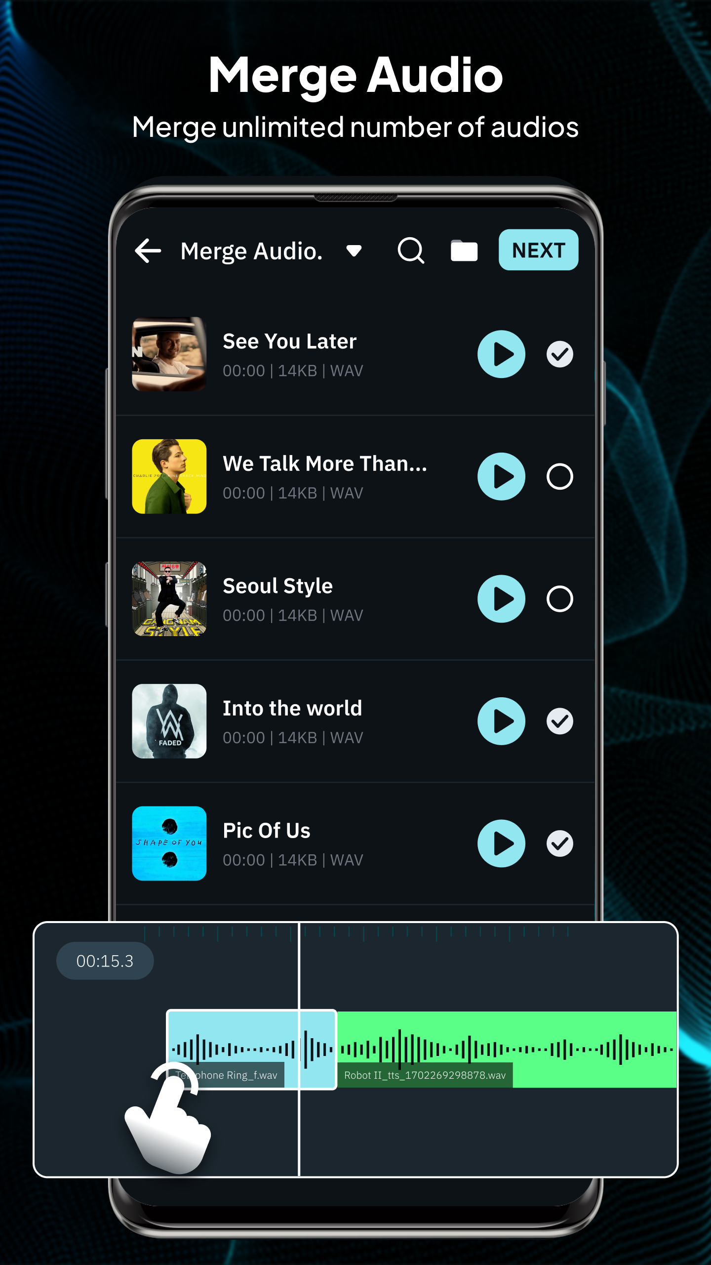 Effortlessly integrate your audio components using our Merge Audio function. Combine an unlimited number of audio files. Whether you're joining songs, producing podcasts, or mixing sound effects, our user-friendly application ensures a seamless and straightforward experience. In just a few steps, you can create a unified and engaging auditory journey.