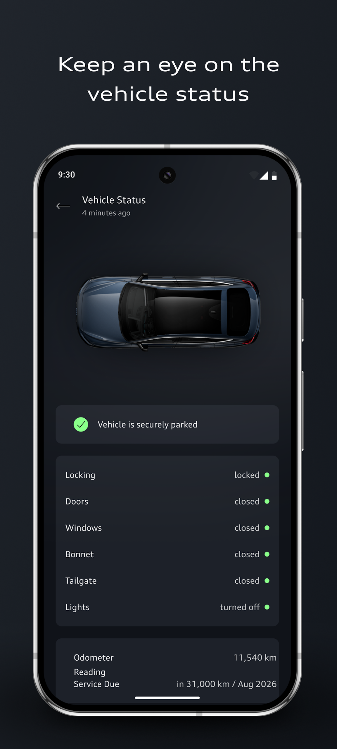 With this app, you can view important information about your Audi, such as the current fuel level and estimated driving range. You can also get a quick overview of the car's current status, including any pending maintenance tasks.