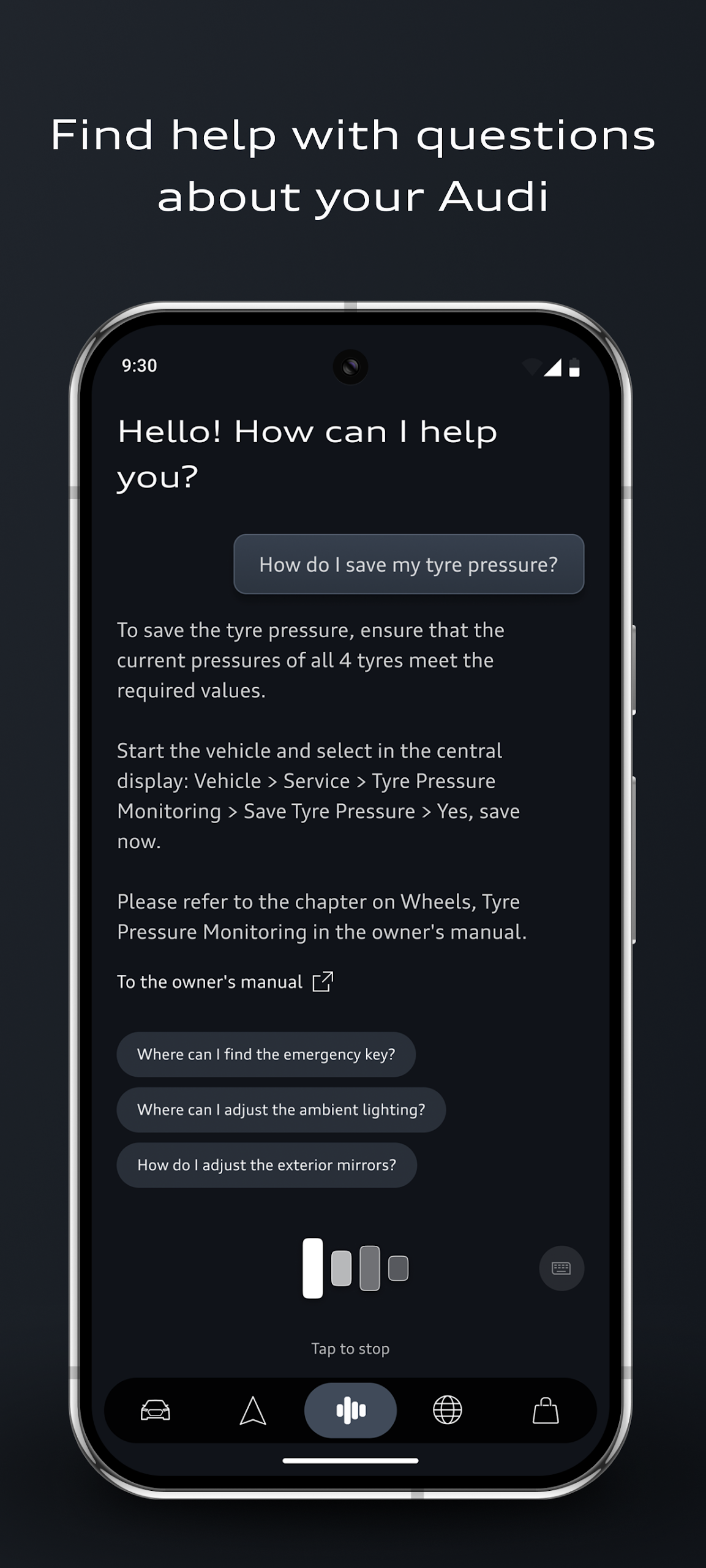 The myAudi app is designed to offer you a better way to stay connected to your Audi, as well as provide you with helpful information that will help you to drive safely and confidently.