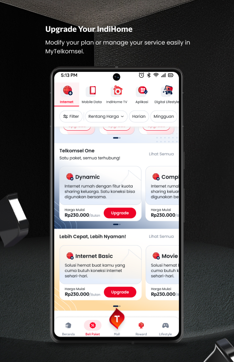 Introducing Telkomsel One as well—our novel offering that merges IndiHome home internet, Kuota Keluarga cellular service, and Orbit internet. Browse the Telkomsel One packages on the MyTelkomsel dashboard and relish uninterrupted internet connectivity wherever you go.