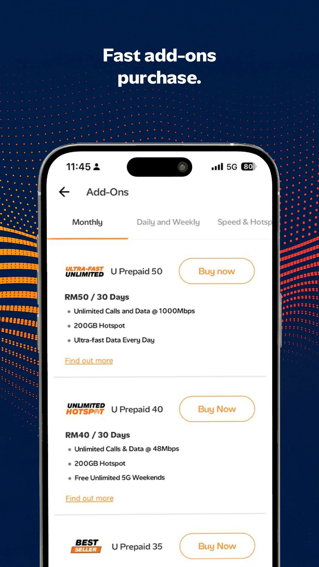Introducing the brand-new MyUMobile App, your ultimate app for overseeing your U Mobile account and indulging in exclusive Rewards! Access all of U Mobile’s features conveniently - monitor your invoices and records, review your past top-ups, keep tabs on your usage, and transition to cashless payments by settling your bills or topping up through the app. And that’s not even the best part! From the app, you can also acquire Add-ons, opt for Additional Data, Voice Minutes & SMS, as well as claim special Rewards. This application is solely available for U Mobile Prepaid and Postpaid users.