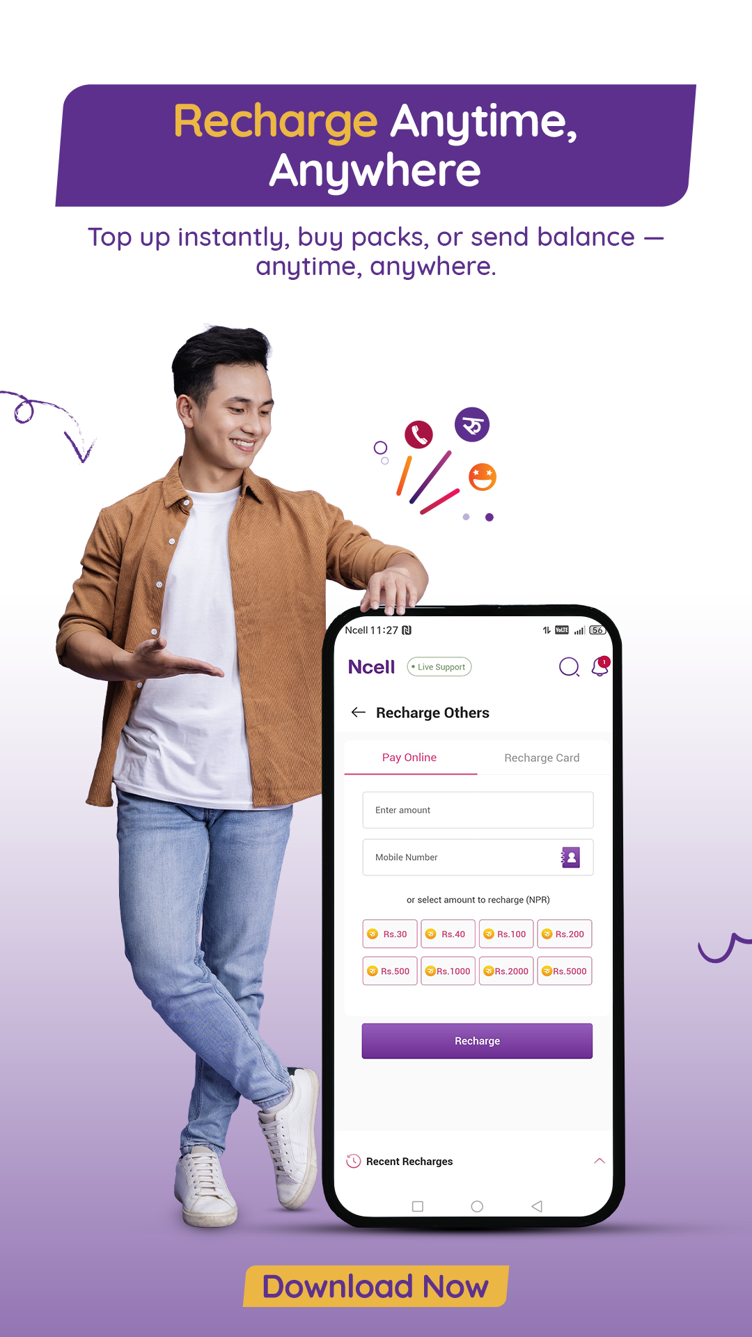 The Ncell app offers a wide array of services, products, and information to its users. Users can enjoy features such as online recharge, checking data balance, purchasing data packs, sending free daily SMS, viewing call details, and accessing specially tailored offers.