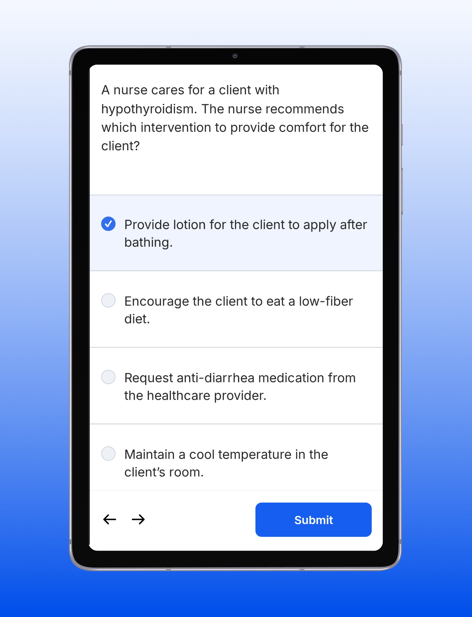 NCLEX Mastery practice questions are designed to be nearly identical to the real exam—right down to the format, difficulty, and variety of question types. We replicate the NCLEX experience so you’ll walk into the test feeling confident and fully prepared to ace it.