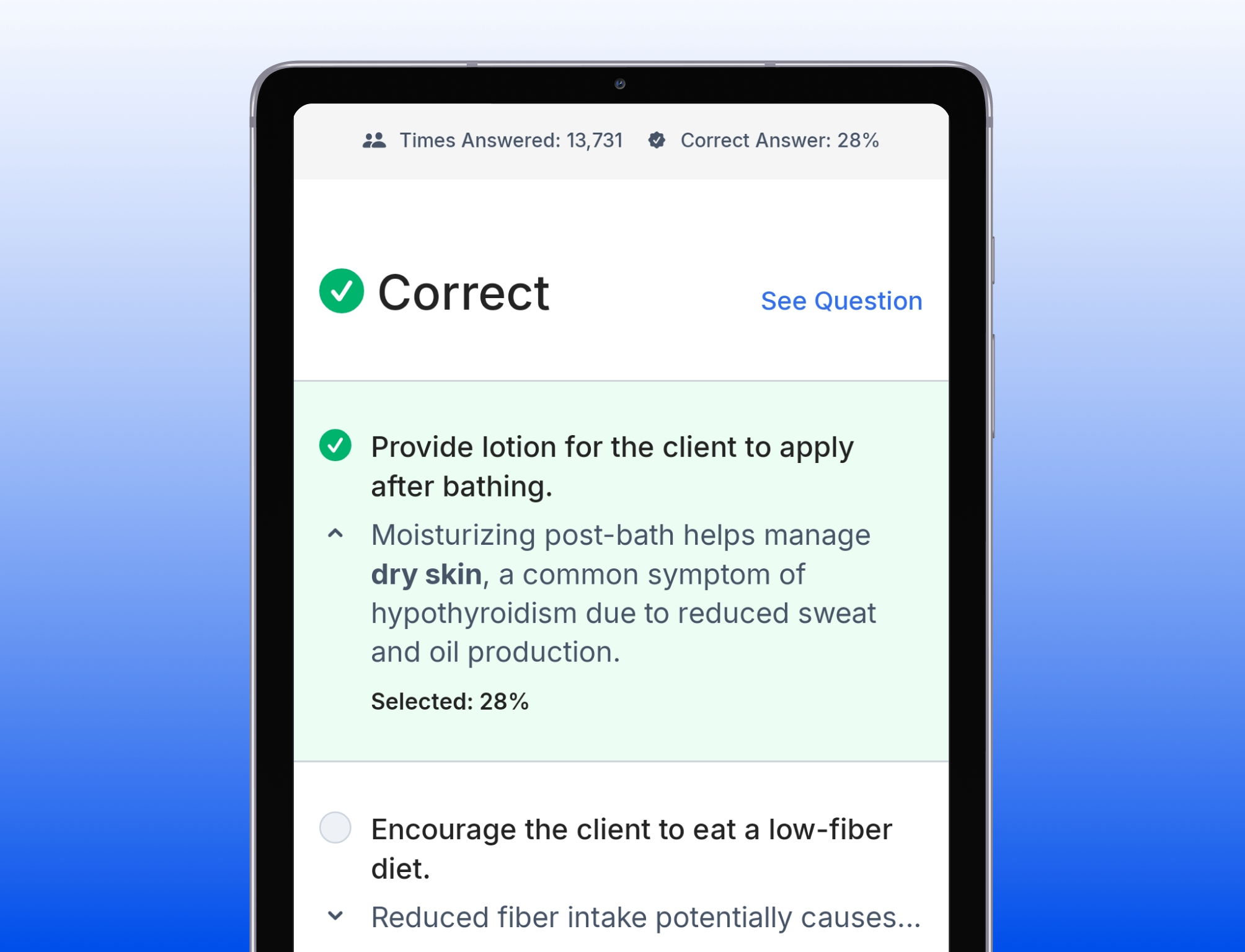The questions and explanations in NCLEX Mastery are written by a team of expert nurse educators, NCLEX specialists, and practicing nurses with years of experience. Every question goes through a rigorous review process by our subject matter experts to ensure it is clinically accurate, relevant, and aligned with the latest NCLEX standards. This thorough process ensures you’re studying with reliable, up-to-date content specifically crafted to help you excel on test day.
