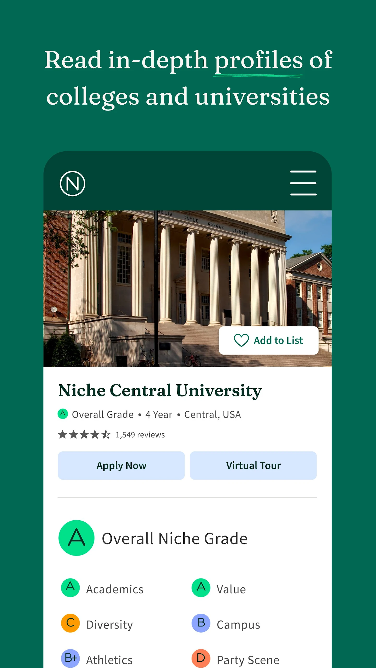 The Niche app offers detailed profiles of every college across America, allowing you to explore both familiar institutions and those you have yet to learn about. Through Niche, you can access student and alumni feedback, receive tailored college suggestions, pursue scholarship opportunities, and much more.