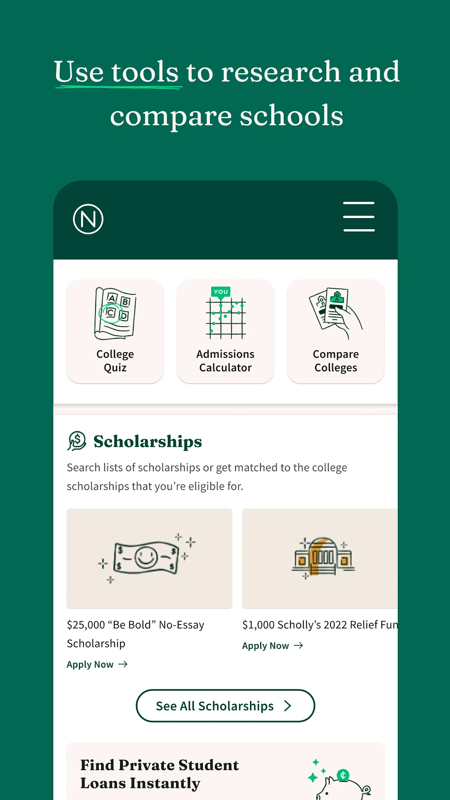 • Scholarship search: Search and apply for college scholarships based on categories or get directly matched with scholarships suited to your qualifications.