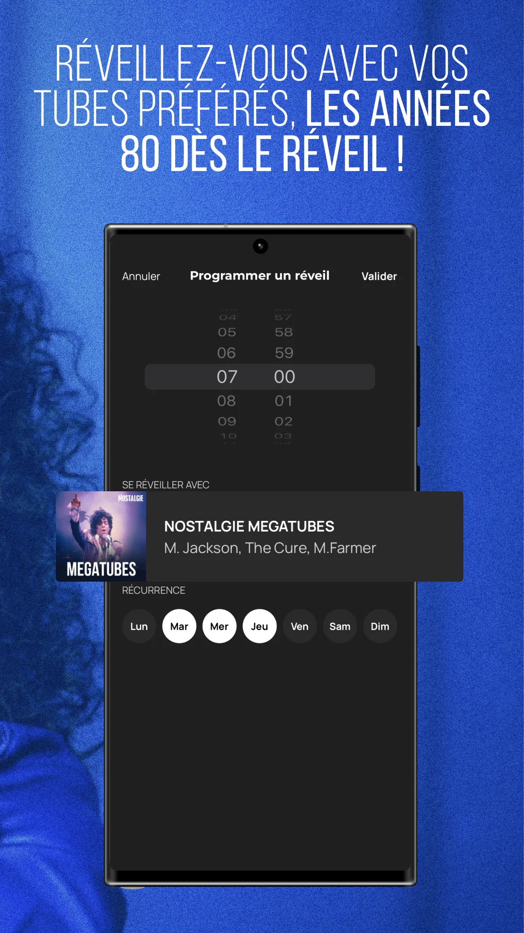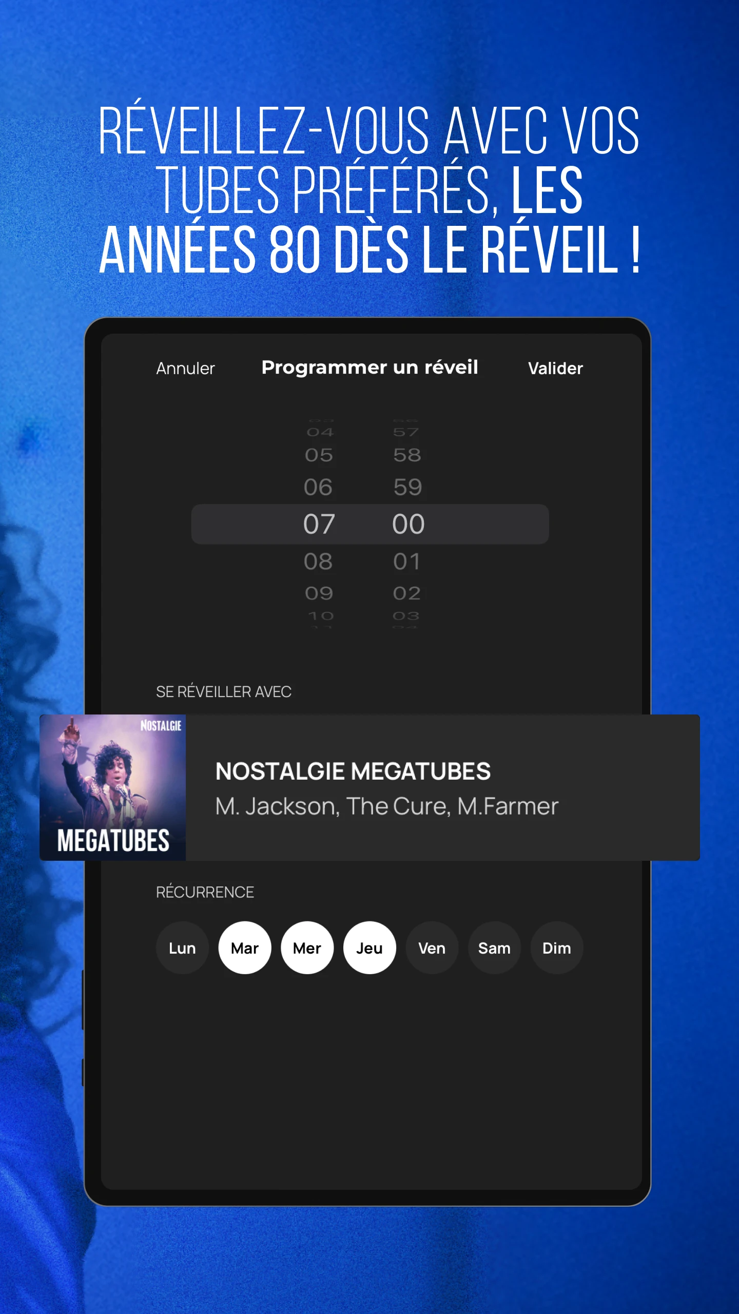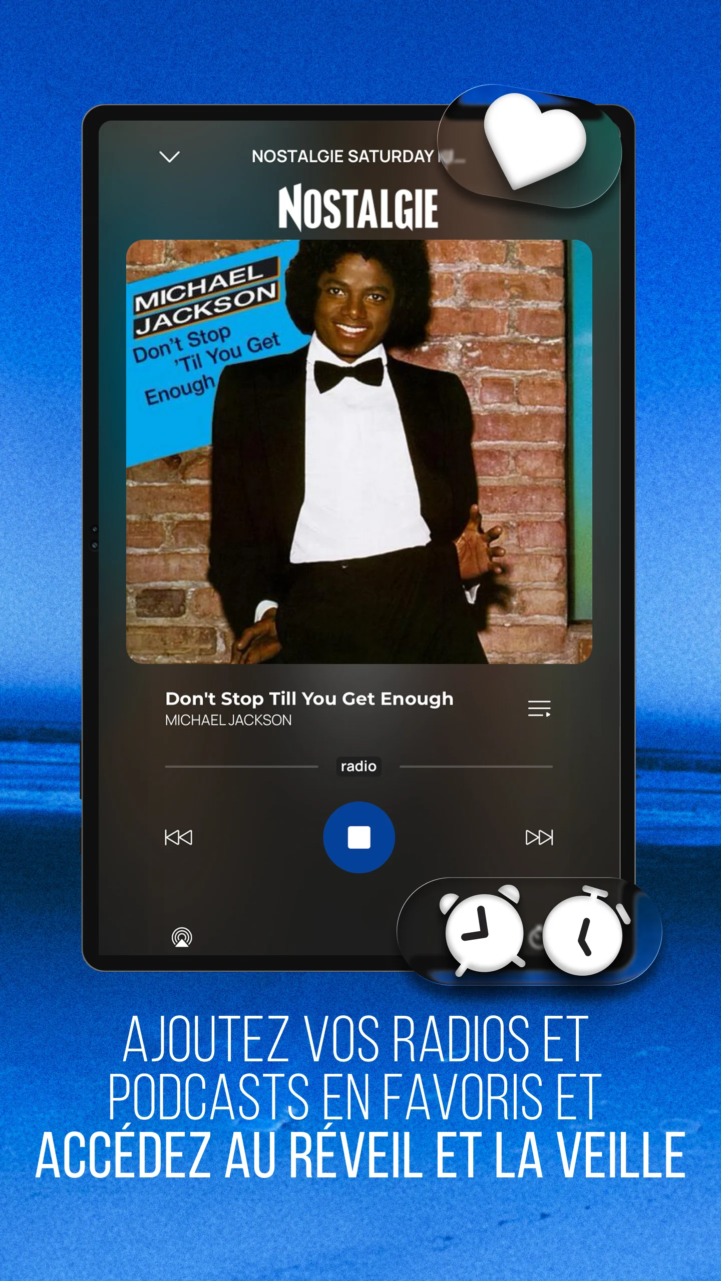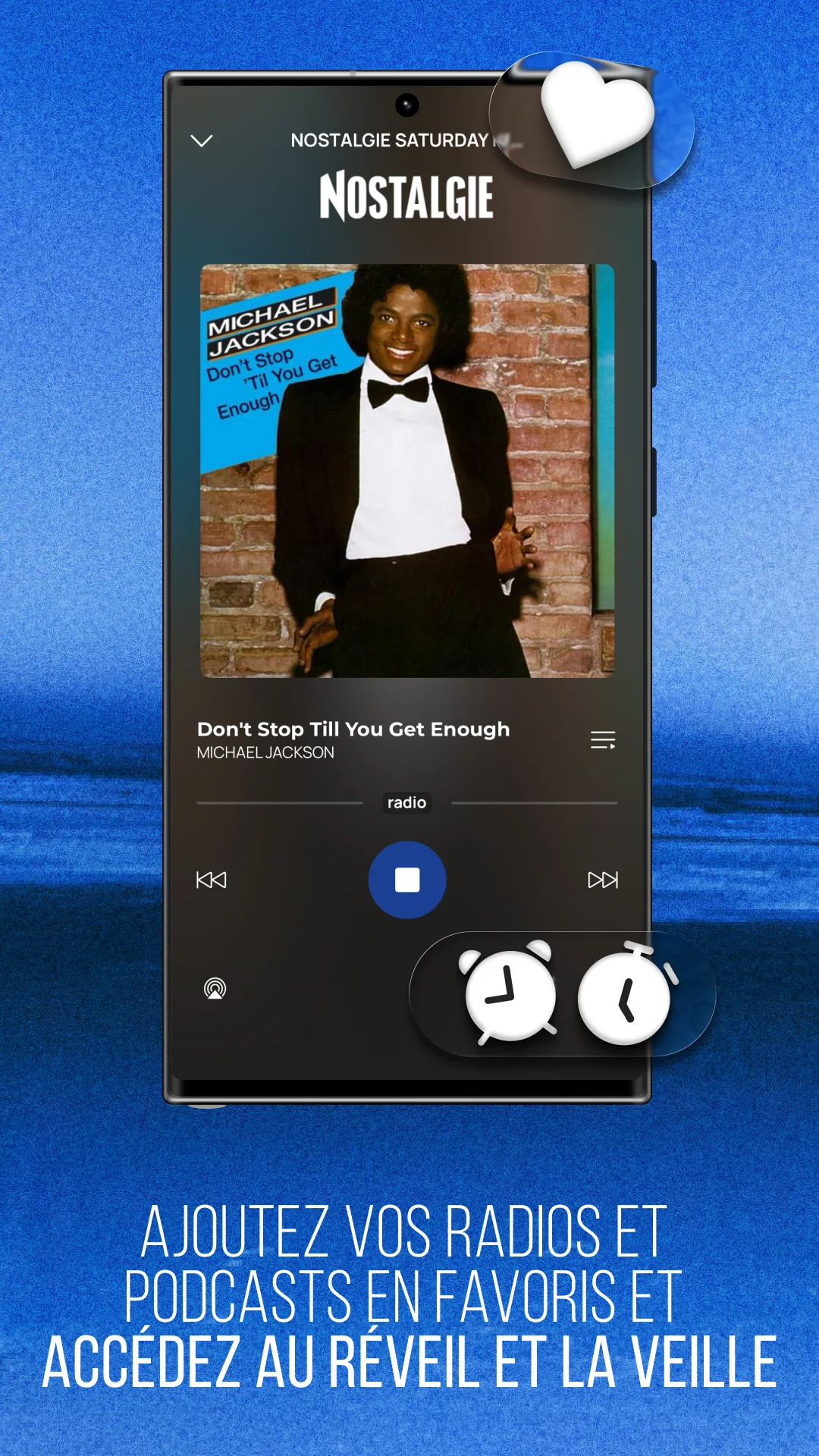 • Wake up with Nostalgie or one of the 250 radios of your choice using the "Alarm" function.