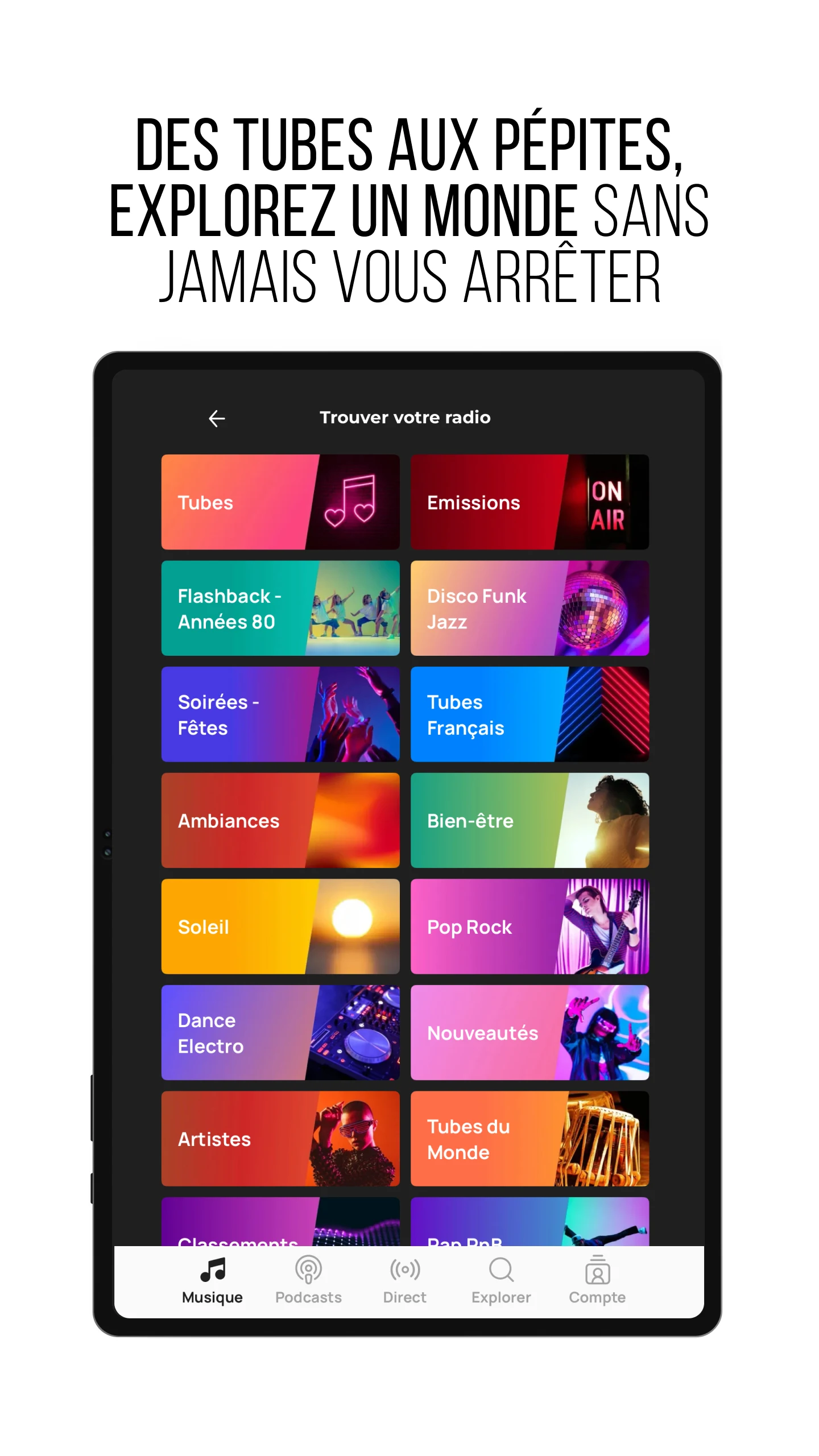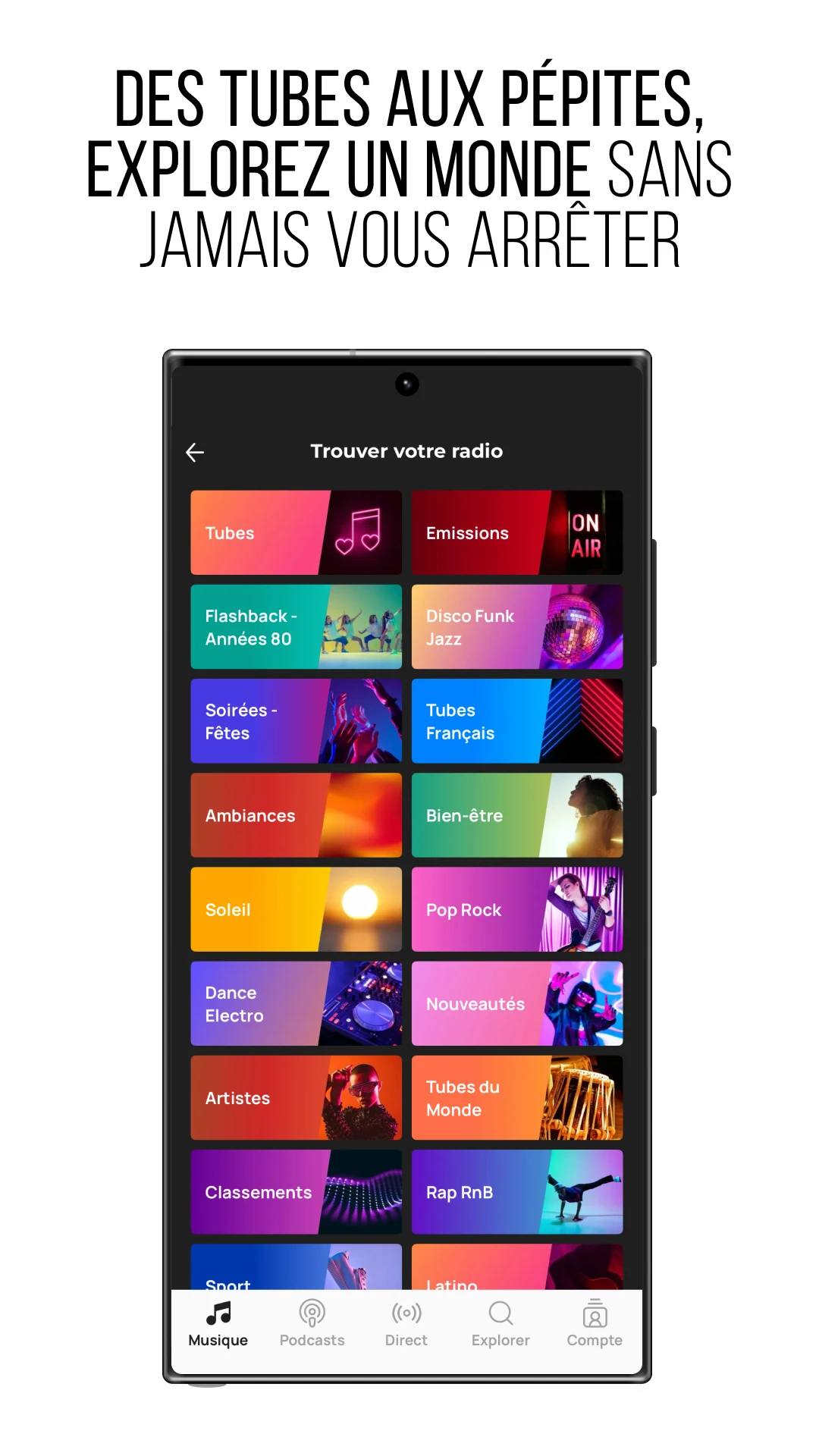 Further expand your auditory realm with a simple tap on the NRJ, Chérie FM or Rire & Chansons logos, seamlessly transporting you into their respective worlds, all the while maintaining access to the full spectrum of NRJ Group's radio and podcast library. With over 150 podcast programs, including original and exclusive content, variety is at the core of the experience.