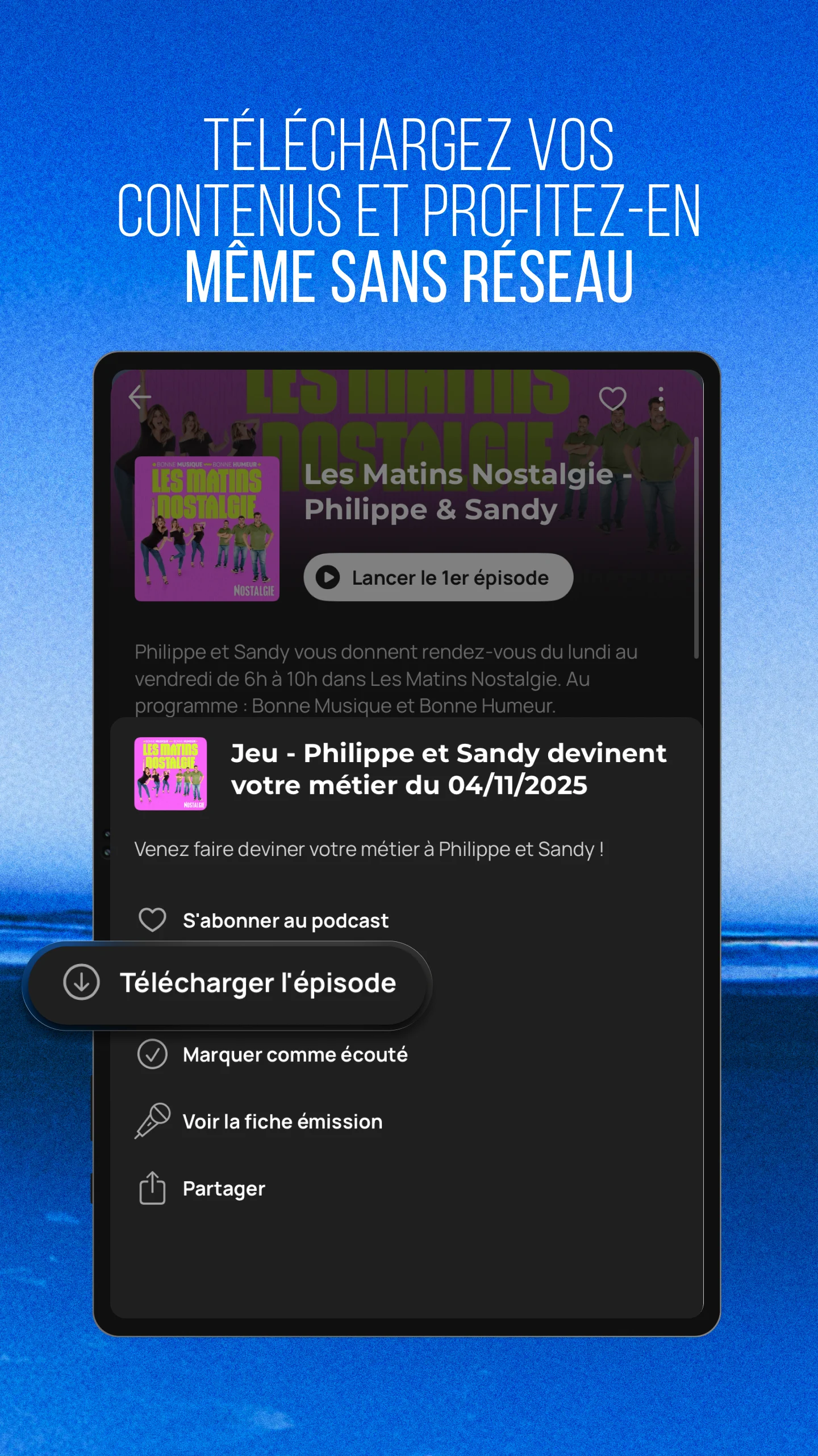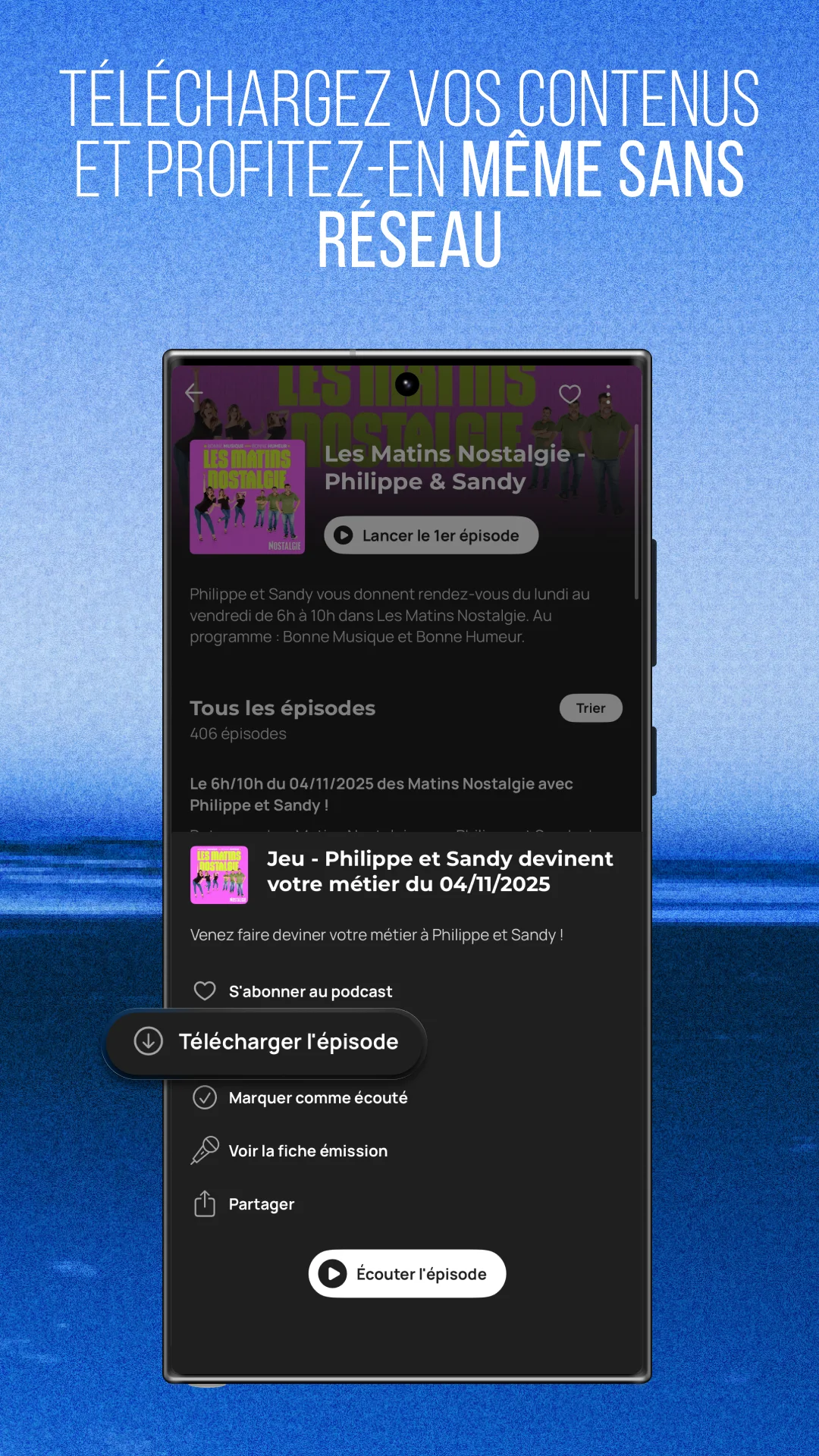 Tap into local vibes by enabling geolocation to stream your nearby radio station and catch up with local news podcasts automatically. Start your mornings with the energetic voices of Philippe and Sandy, or brighten your day with their "Good music, Good mood" show, available live or on-demand through program podcasts.