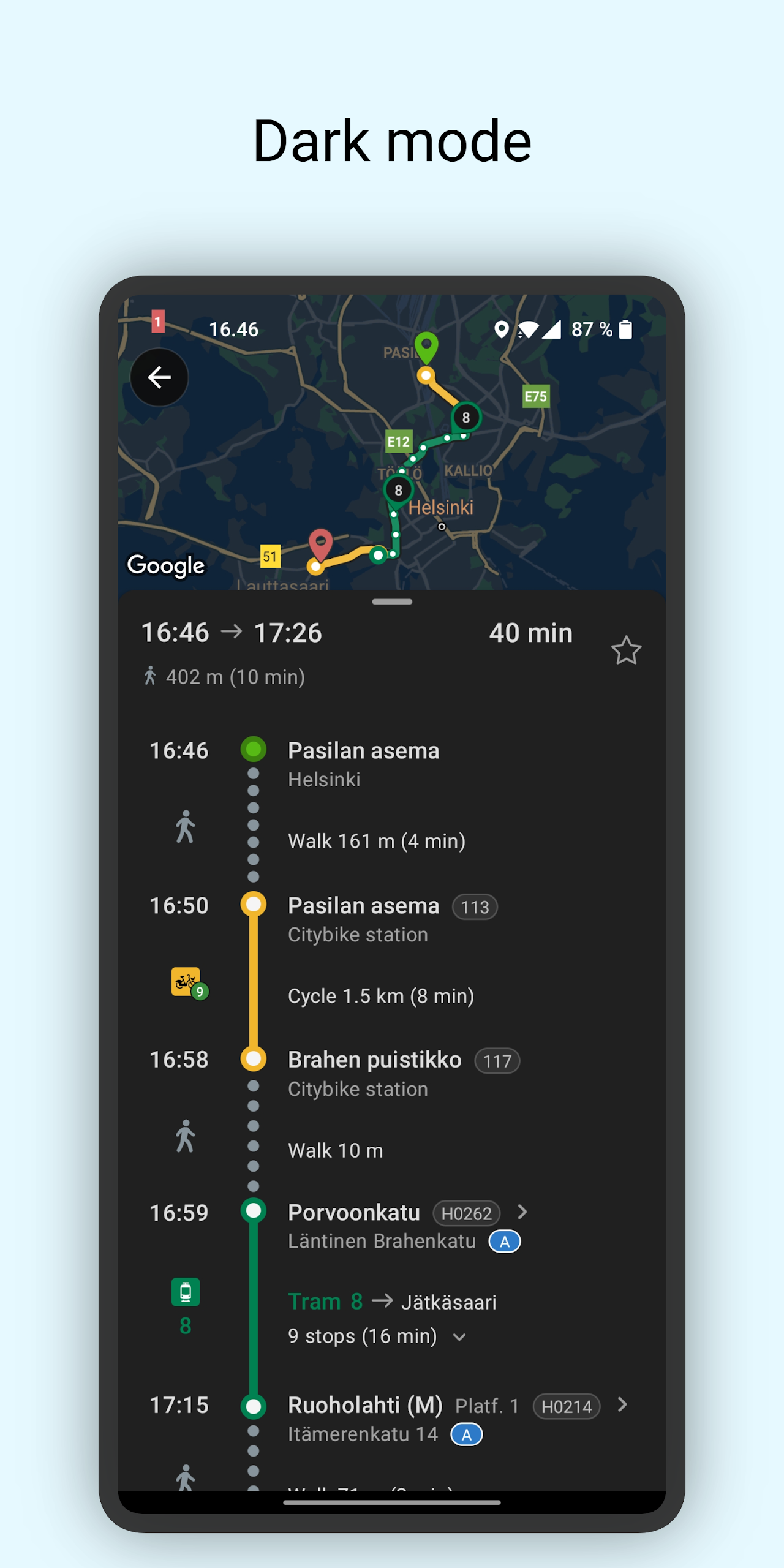Absolutely. The app covers 18 regions across Finland, including Helsinki (HSL), Turku (FĂśli), and Oulu, with tailored route planning and real-time data for each network.