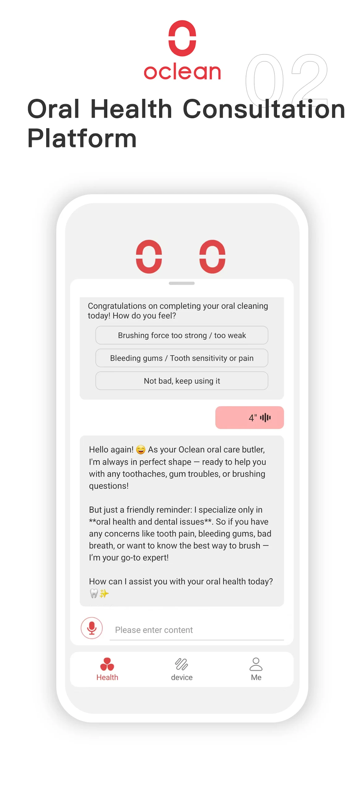 The Oclean Care health data platform offers expert oral care advice, integrating Oclean’s smart oral care devices and information services to assist you in developing systematic and scientifically-based oral hygiene practices.