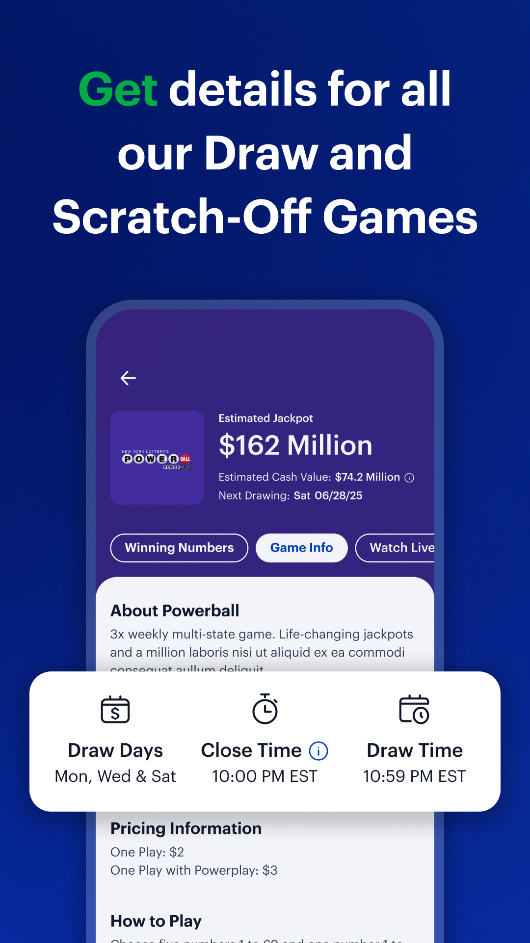 • Draw Game Info - Access details about draw game schedules, jackpots, and more directly from your device.