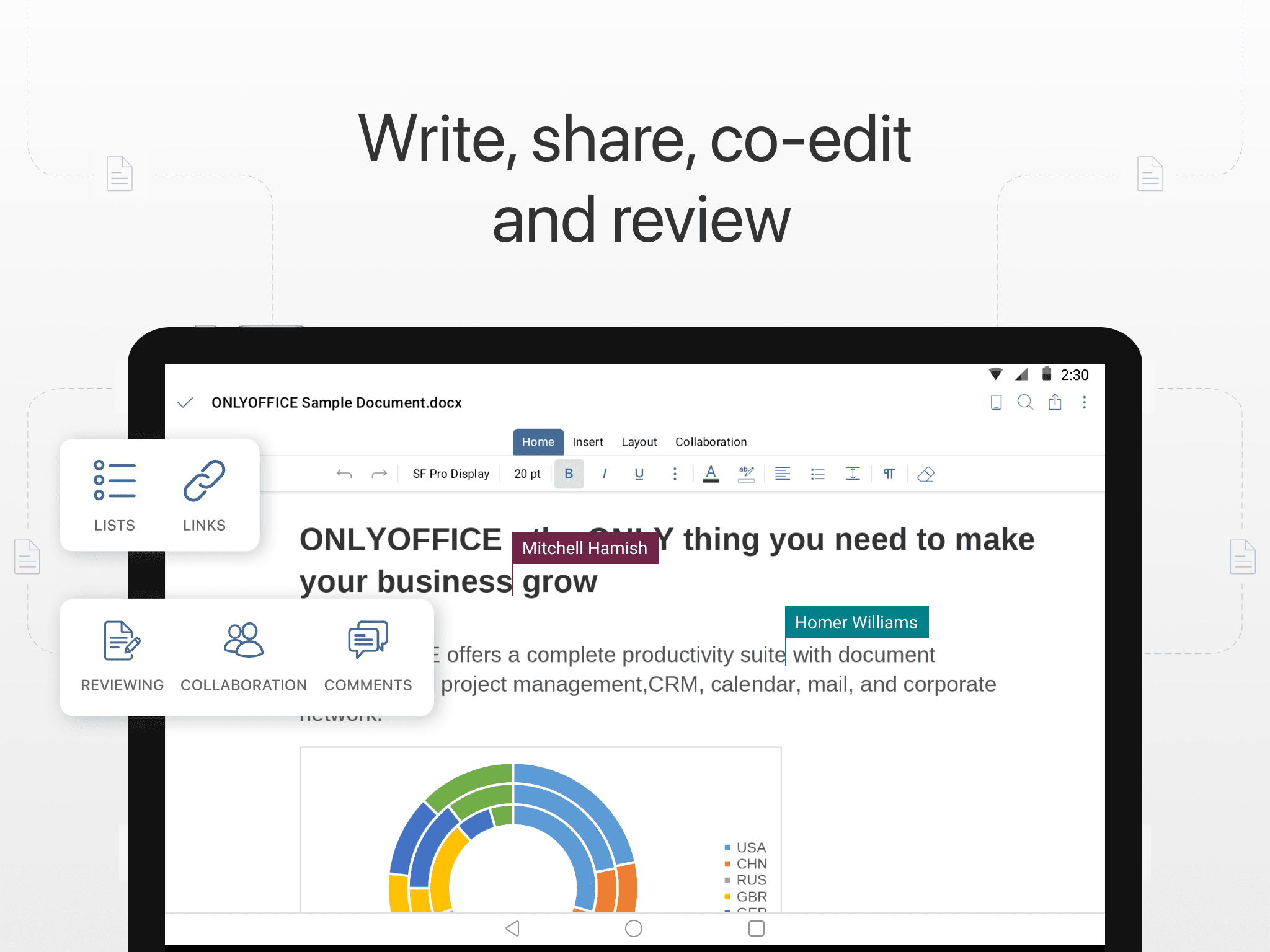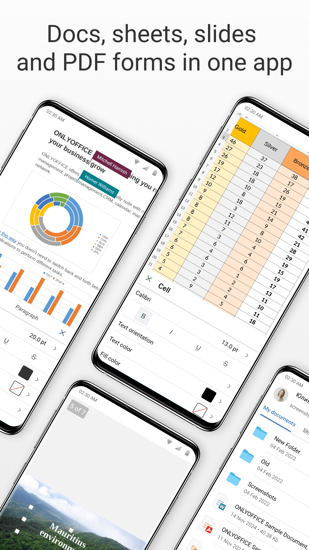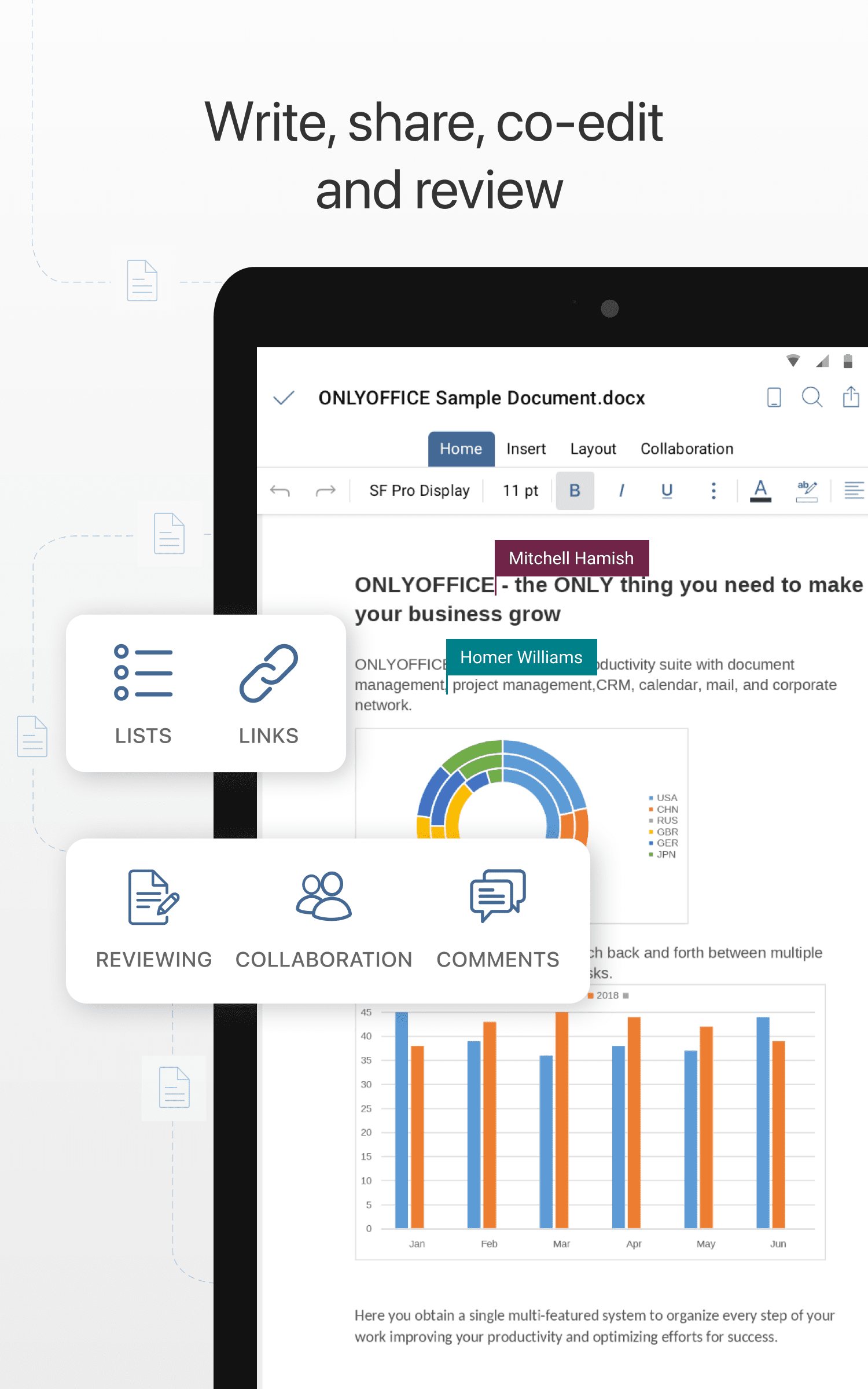 ONLYOFFICE provides a full range of tools to create, edit and collaborate on text documents, spreadsheets, presentations, PDF forms and regular PDF files on web, desktop and mobile platforms.