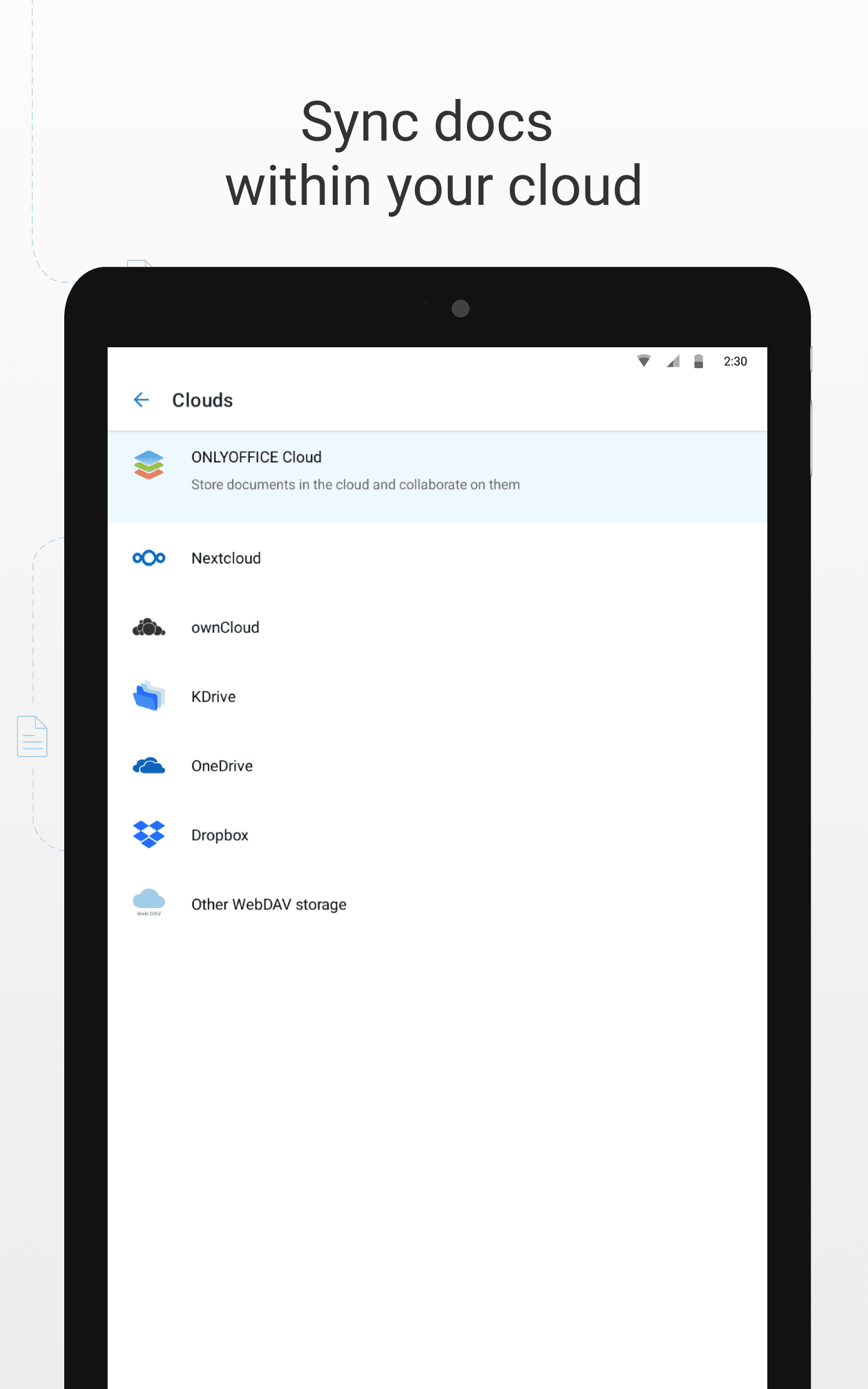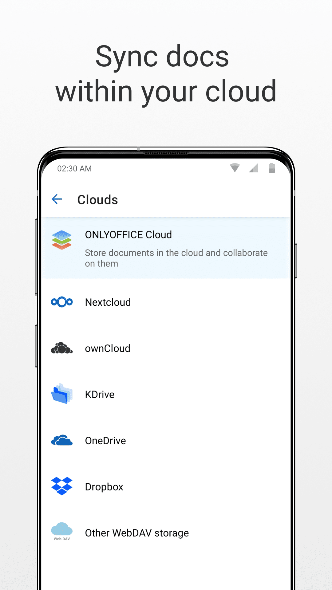 Access cloud services via WebDAV, allowing you to directly manage and edit text documents, spreadsheets, and presentations, as well as view PDFs stored in connected cloud accounts. You can download and upload files as well as manage collections and directories.