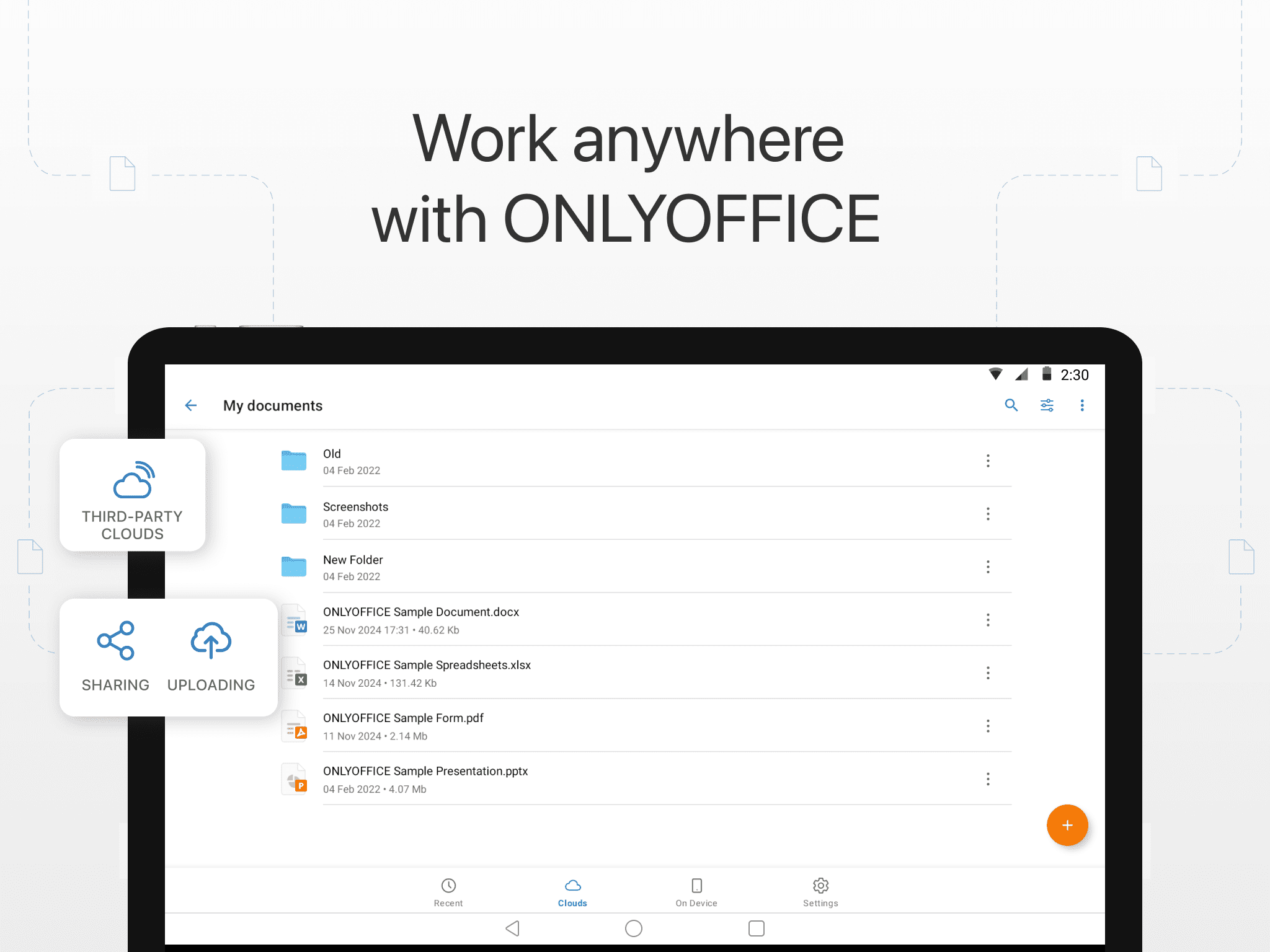 Upload and download files, sort, filter, rename, and delete them, as well as mark favorites. To utilize the app in the cloud, an ONLYOFFICE portal is required, whether it's corporate or a free personal account. If you lack an account, you can easily set one up through the app.