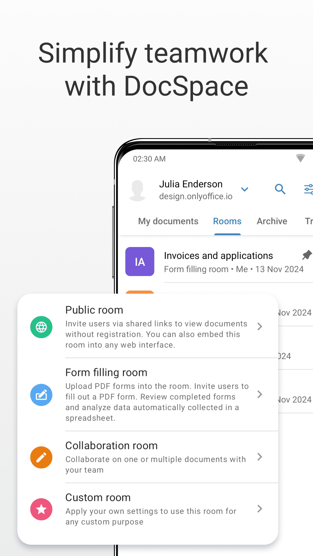 You can use the online editors within any business platform or opt for the room-based content collaboration platform ONLYOFFICE DocSpace which already comes with the integrated editors. Besides, you are able to embed the editors into your own web app.