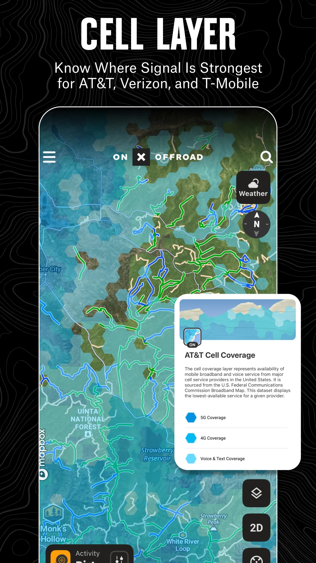 Remain connected even when you're away from urban areas! The new Cell Coverage Layers in onX Offroad provide current coverage information for major carriers. Whether you're embarking on an off-roading adventure, camping, or working remotely, you can identify where you'll have signal for emergencies and confidently plan your activities.