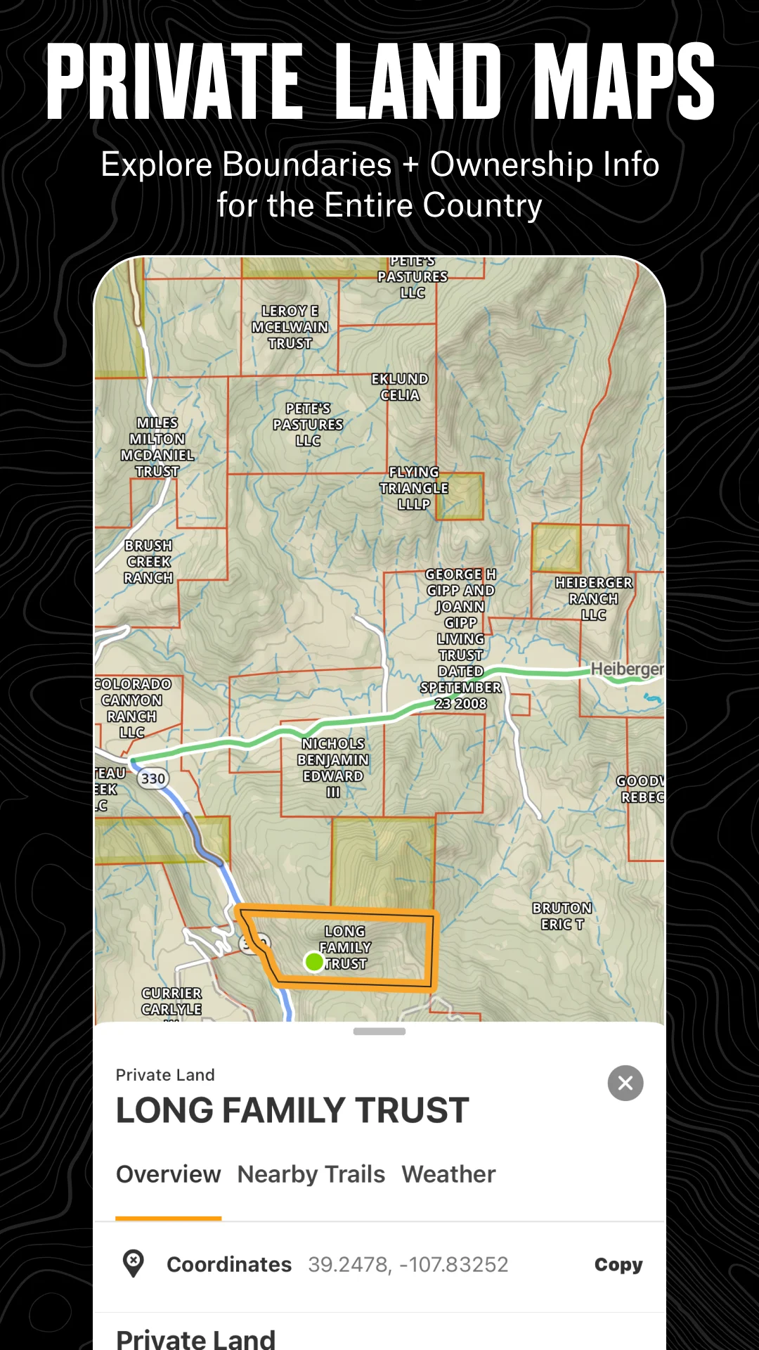 Filter trails based on suitability for 4x4, SxS, dirt bikes, motorcycles, ATVs/Quads, Overland vehicles, and snowmobiles. Gain access to over 650,000 miles of off-road paths across 852 million acres of public lands. The app allows you to view property boundaries, private landowner details, and total acreage.