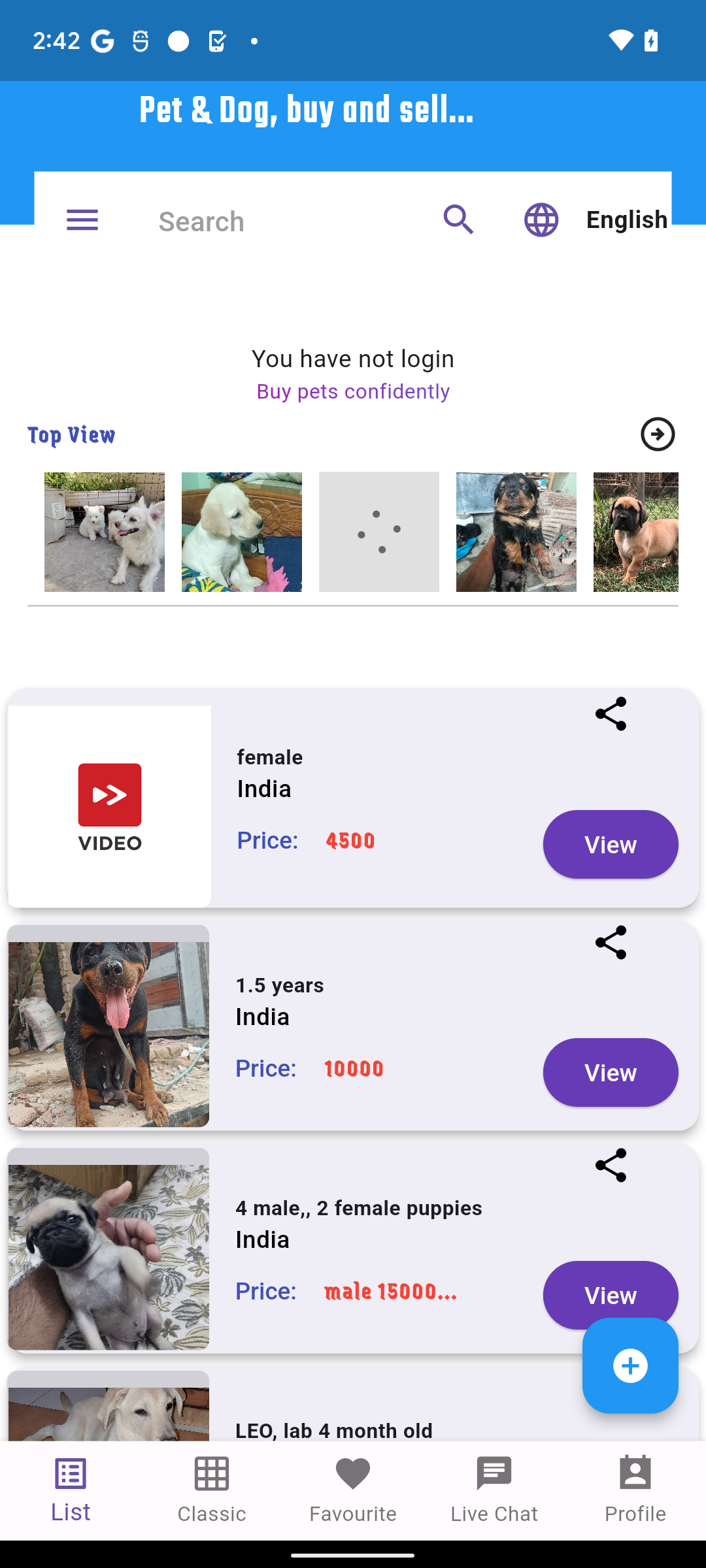 You can find information about the prices of Labrador dogs and others listed by the sellers in the app.