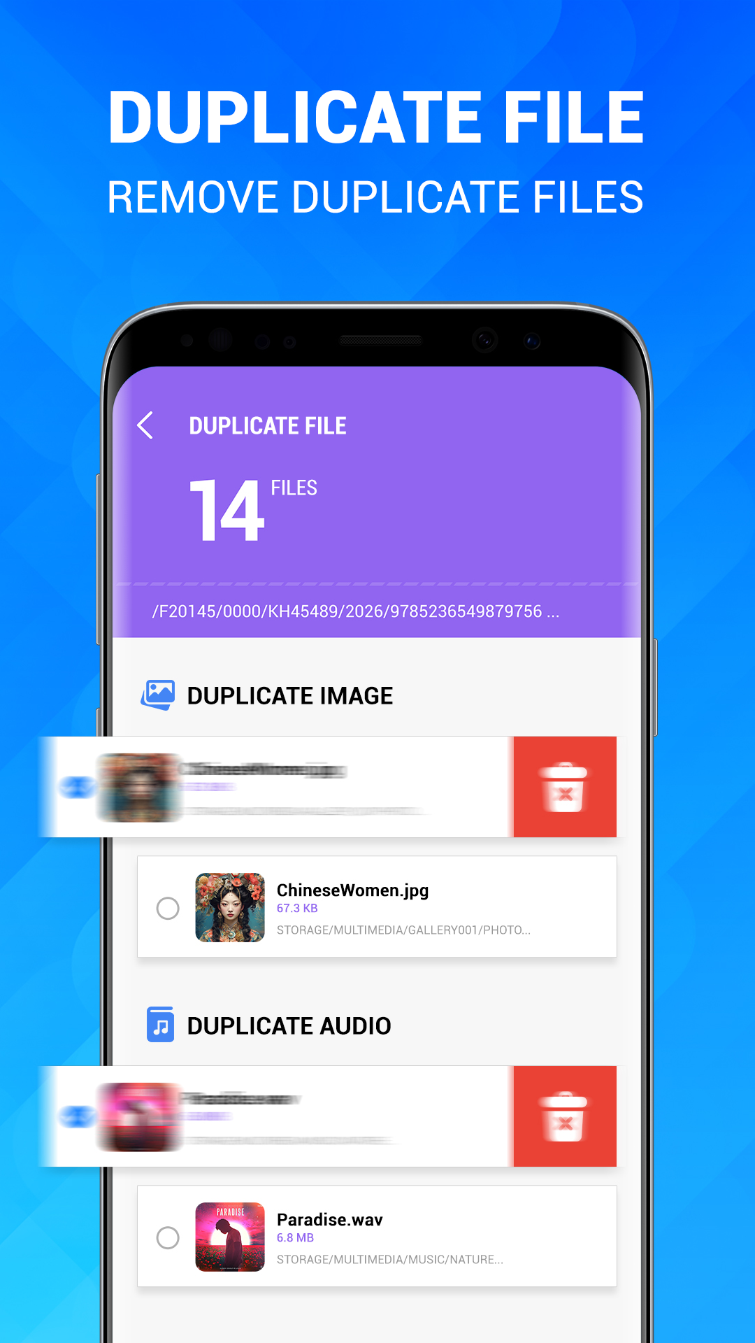 Duplicate Files Remover lets you recover storage space on your Android device by helping you delete duplicate files across a variety of formats. Using this duplicate file finder for Android, you can scan and delete duplicate audio files, videos, pictures, and documents.
