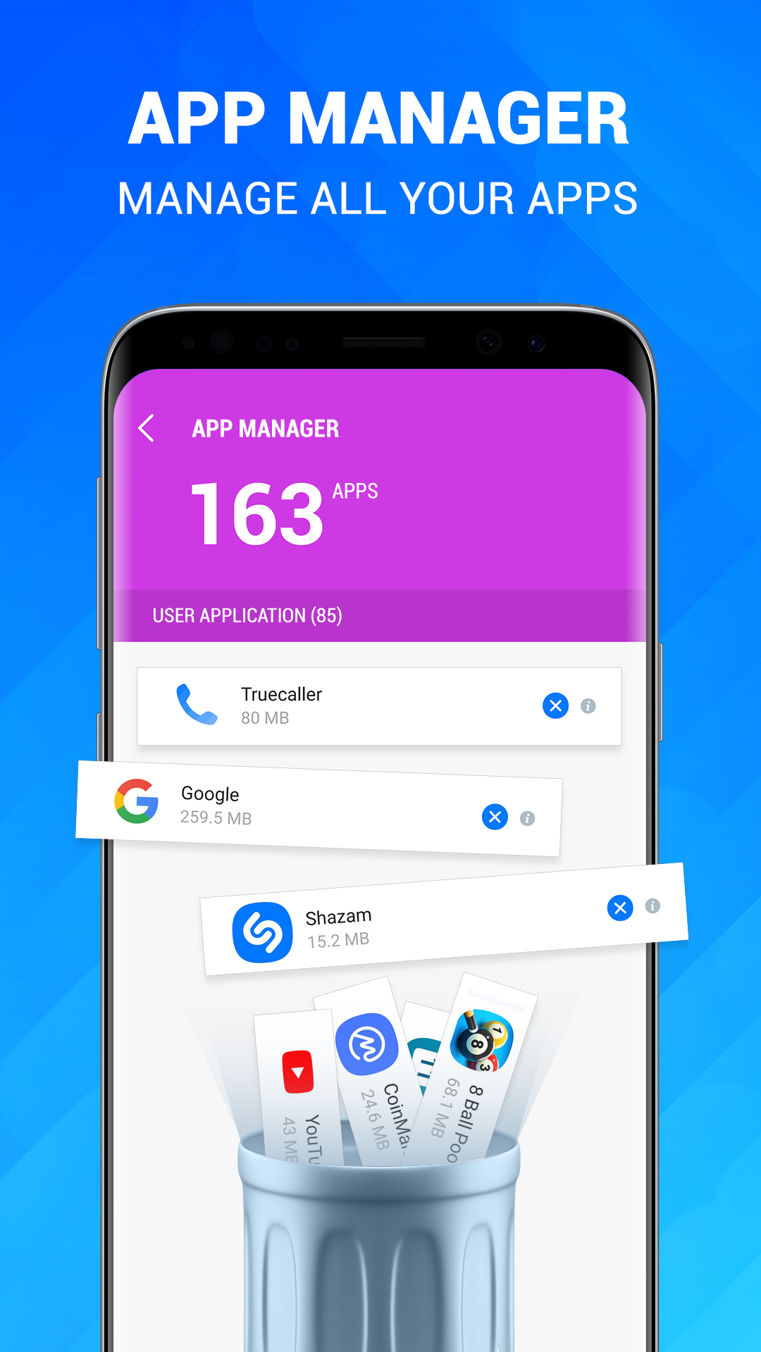 Phone Cleaner is a professional junk cleaner app for free, which has functions of junk file cleaner, app manager, battery manager, duplicate file remover & applock. Just clean app caches and junk files with ONE Click!