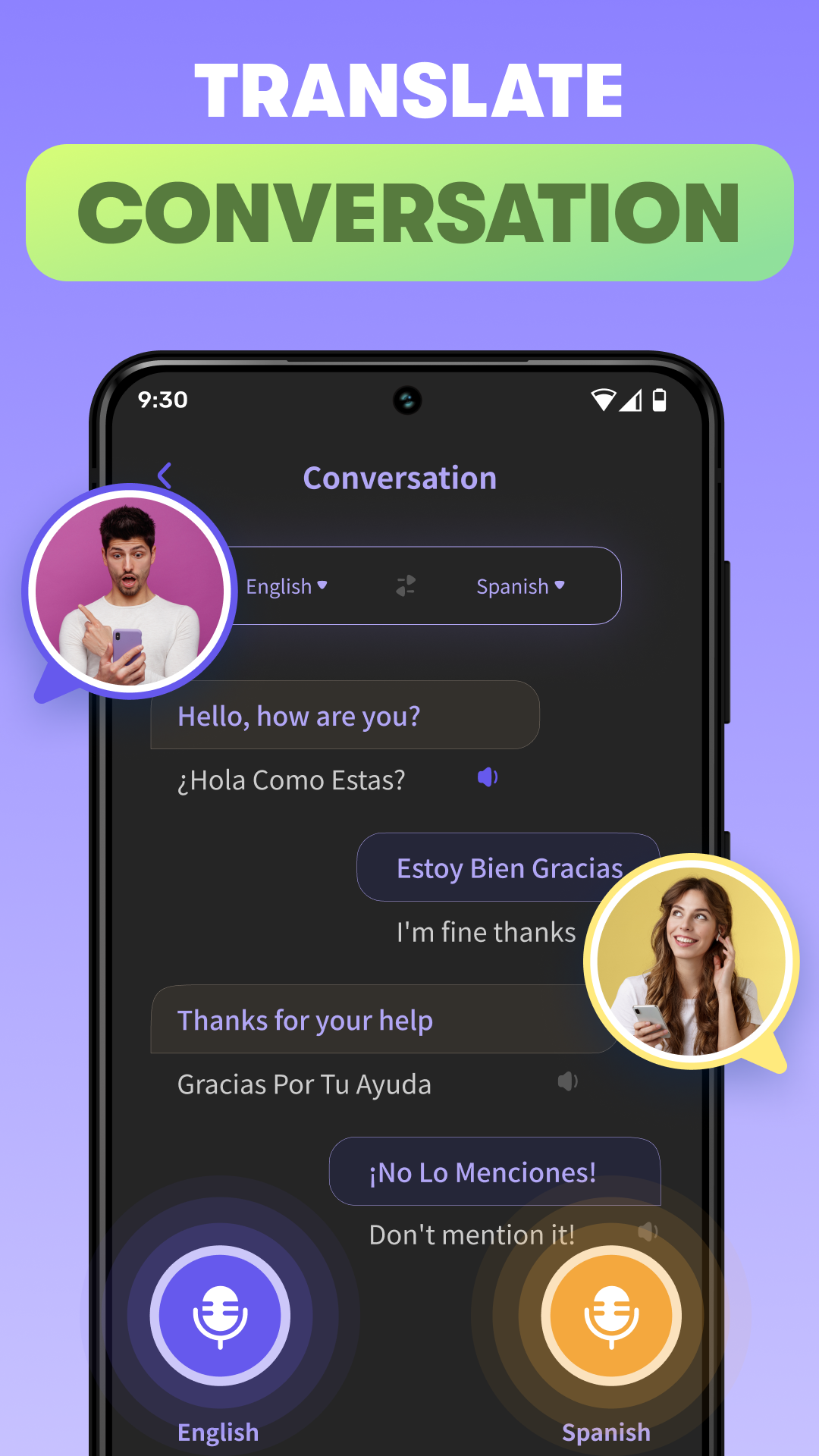 --Access the Conversation section of the application; utilize the two dropdown menus at the top to select the desired languages; press the microphone button located at the bottom of the screen, then speak for translation.