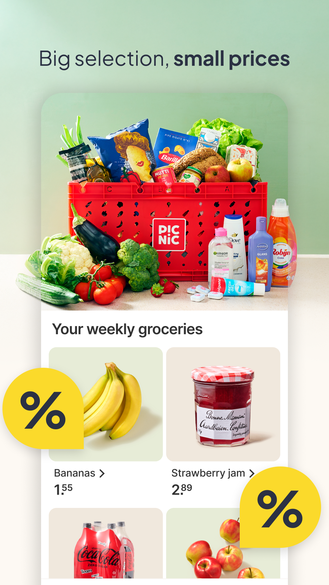 At Picnic, we skip the expensive stores, which translates into constant low prices and complimentary home delivery for you! Alongside your usual shopping, our app features weekly super deals and enticing discount recipes. You save when we save!