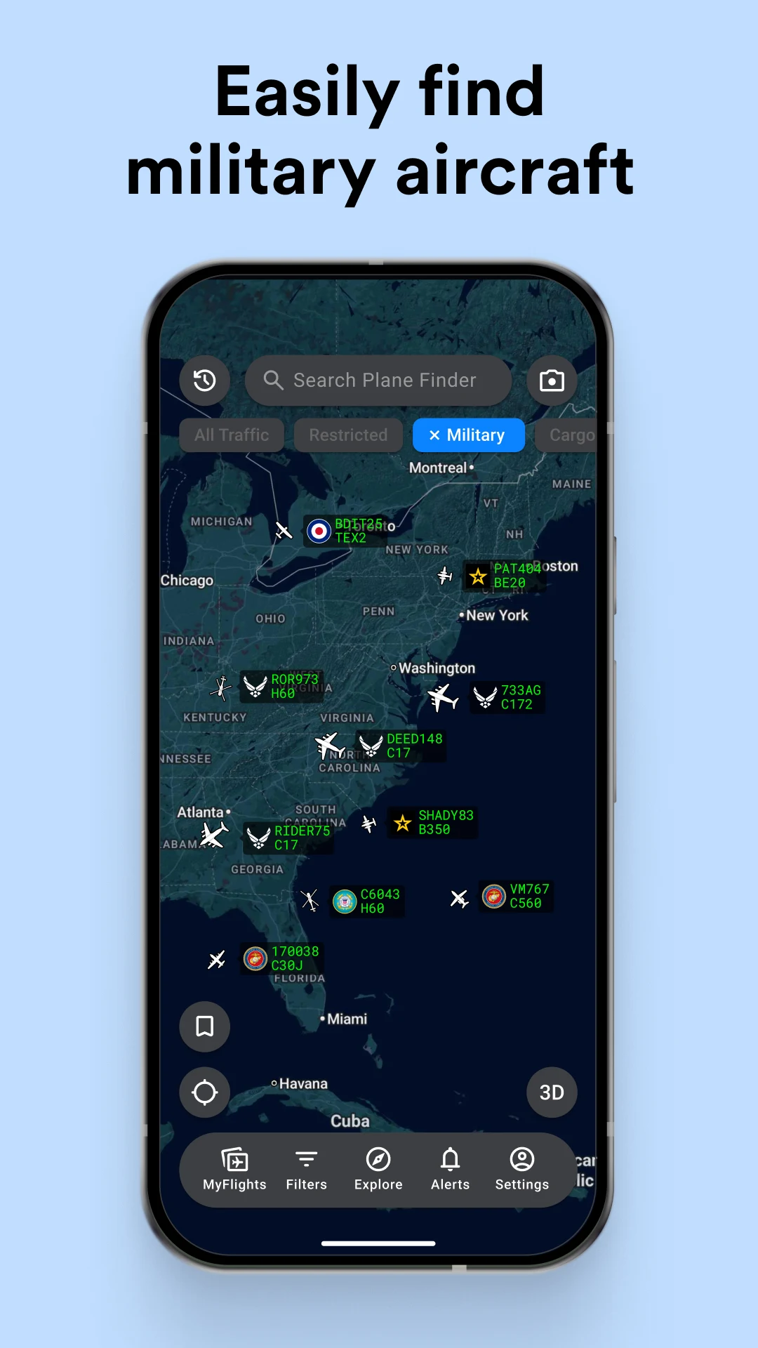 Plane Finder is the sole app that provides live global flight tracking and prompt, precise flight status alerts within a single app. Whether you are a well-informed aviation enthusiast seeking comprehensive information or a curious traveler fascinated by specific flight details, Plane Finder has everything you need. Our exclusive map focus mode swiftly showcases military or other traffic types live on the map, a feature highly valued by aviation enthusiasts. Content creators on social media admire our 3D globe view paired with playback mode. If you don't have a particular flight in mind, fret not! You can explore trending and thrilling live aviation events through our Explore feature. Download now to embark on an immersive journey of discovery with the most captivating flight tracking encounter.