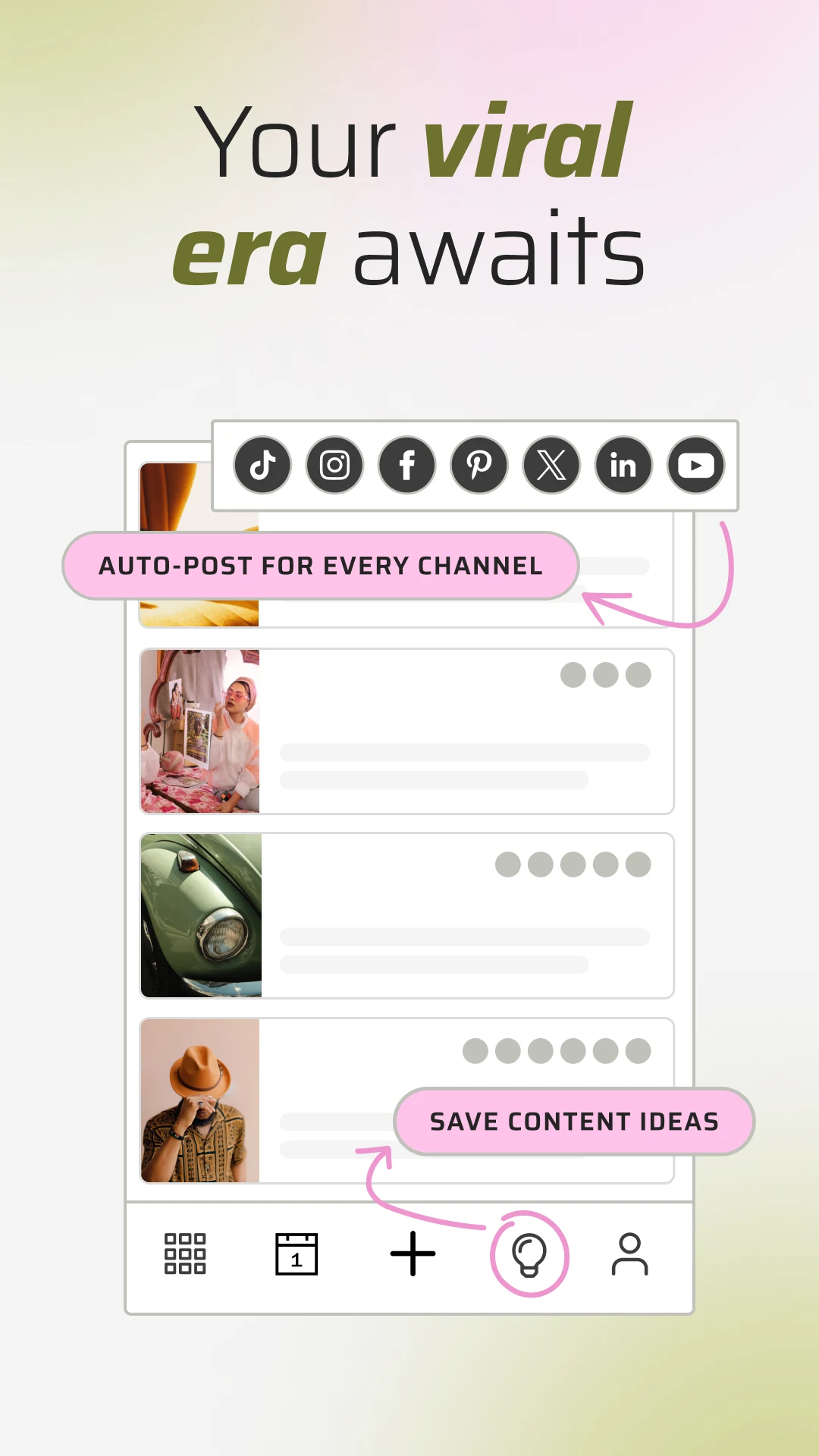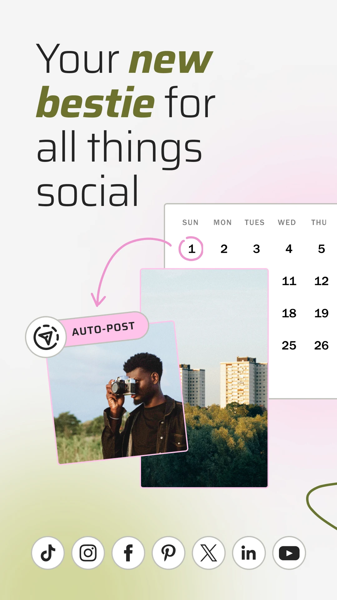 - Utilize Auto-Post feature to publish on multiple social platforms simultaneously, including TikTok, LinkedIn, Instagram, YouTube, Facebook, Twitter (X), and Pinterest