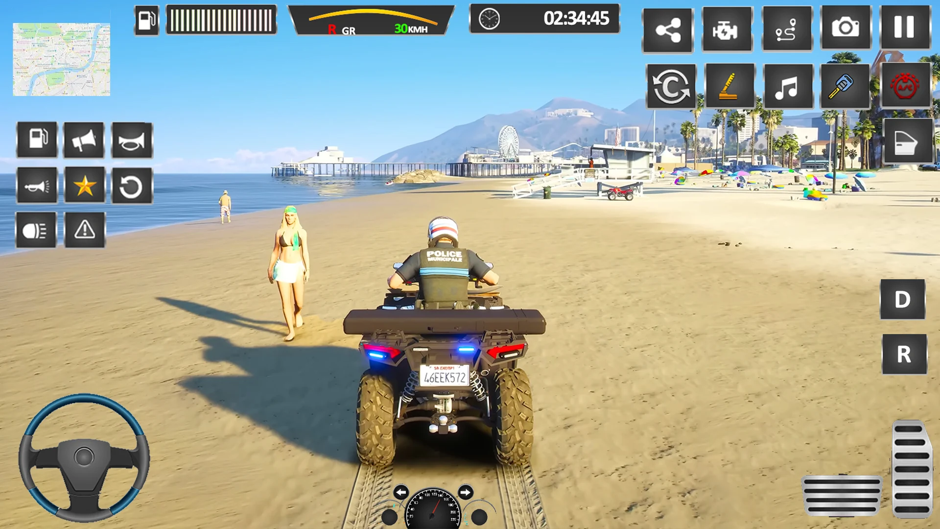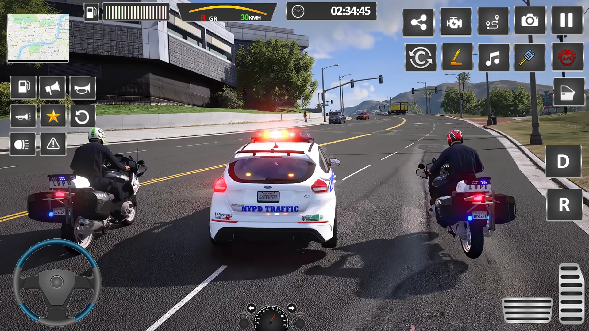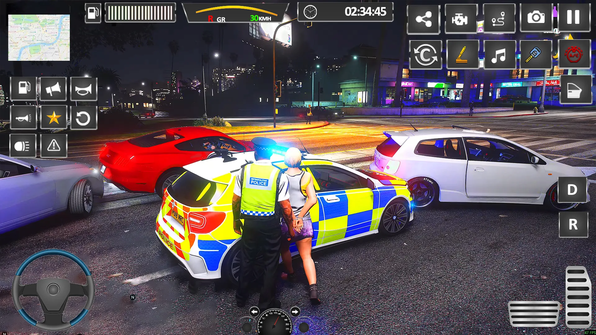 Use virtual joystick or tilt control to drive the police car, support touch, steering wheel and tilt control.
